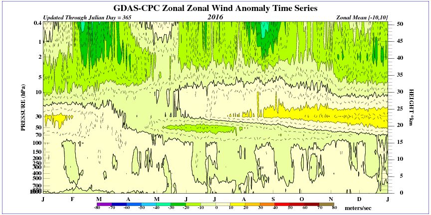 Tot slot de zonale anomalie voor het jaar 2016. In dat jaar was de QBO verstoord. Dit patroon is duidelijk niet standaard (zie afbeelding 4) en zo'n afwijking doet zich ongeveer eens in de 10 jaar voor.