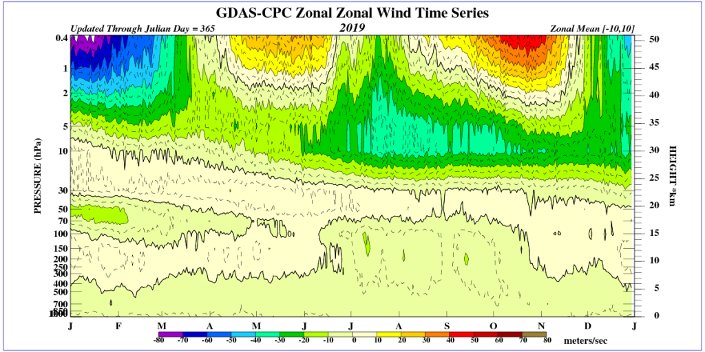 Op onderstaande afbeelding 1 het verloop van de zonale (= westelijke) windsnelheid boven de tropen tot 50 km hoogte van 2019. Groen en blauw geven oostenwind weer en geel, oranje en rood westenwinden.