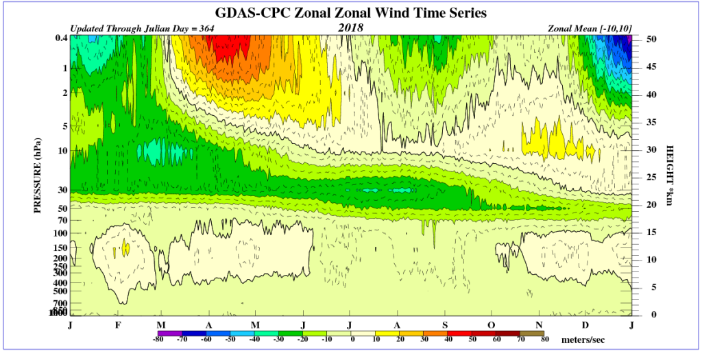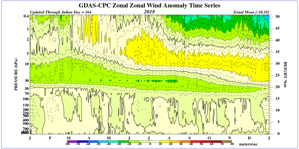 Op de afbeelding 2 de stratosfeer van 2018. Het jaar begint met over de gehele stratosfeer oostenwinden (links is alles groen) maar als het jaar vordert concentreert de band met oostenwind zich rond 30 hPa en is er dus sprake van een sterke QBO-oost. Aan het eind van het jaar daalt de gordel af tot een 50 hPa. Helemaal bovenin komt met golven de westenwind erin en aan het einde van het jaar de oostenwind weer (rechtsbovenin). Omdat ook seizoensinvloeden meespelen komt de QBO duidelijker naar voren als je naar de anomaliekaart kijkt. Deze geeft de afwijking van de wind ten opzichte van de klimatologie aan. In afbeelding 3 is dat te zien voor hetzelfde jaar 2018.