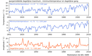 Interessante studie Bart. Dat het het KNMI tot een andere conclusie komt zie je aan de grafiek. In de eerste helft van de vorige eeuw is er een afname van het verschil tussen Tmin en Tmax en dan eigenlijk vooral in de jaren '50.