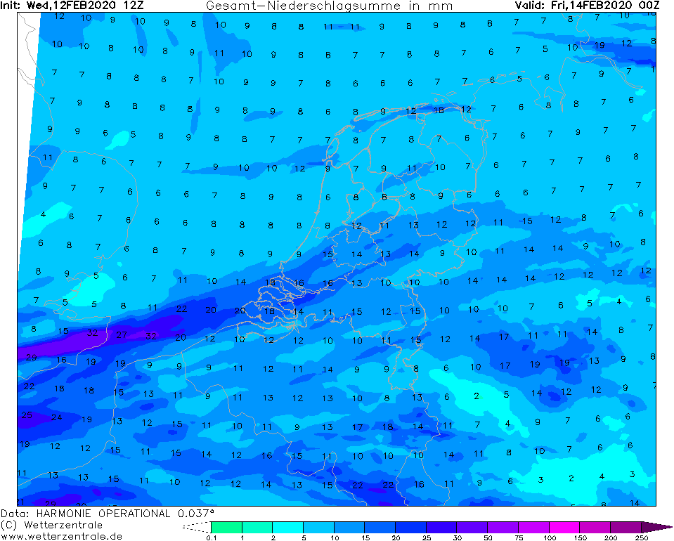 Harmonie 12Z run, cumulatieve neerslag tot vrijdag 1u: