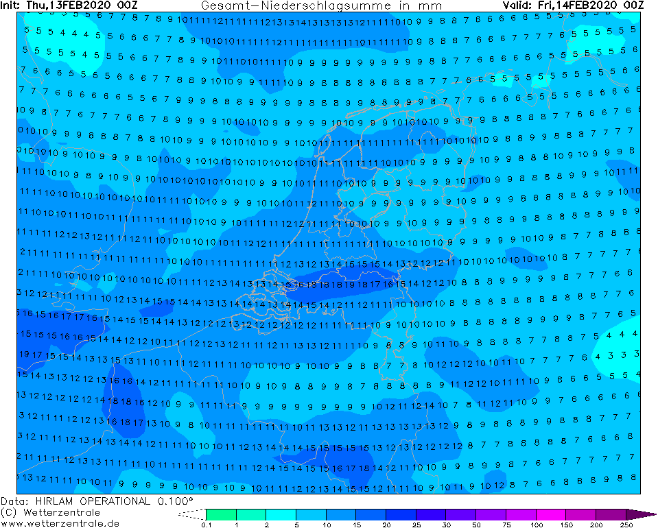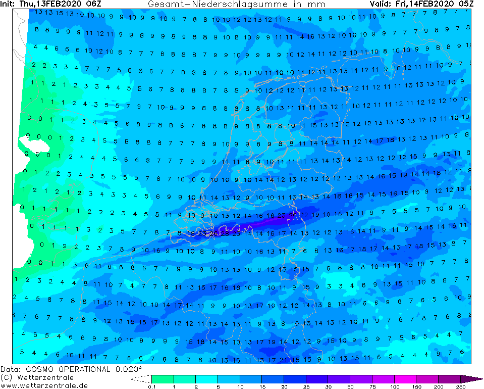 De korte termijn modellen komen ook met een aantal stevige buien. Harmonie heeft de meest stevige buien het meest noordelijk (met hier een dagtotaal van 20mm), Cosmo het meest zuidelijk en Hirlam zit er tussenin met de meeste neerslag over het rivierengebied. Onderstaand de door de modellen verwachtte dagsommen: