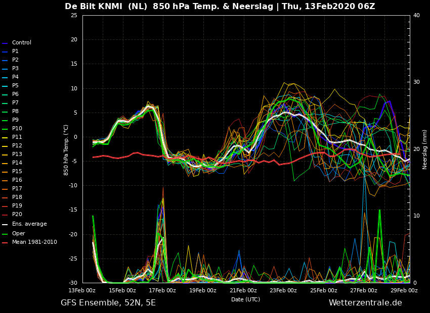 Dat is inderdaad een meer dan perfecte timing! Ik heb zowel de EC Oper als de GFS Oper met veel plezier gadegeslagen. Ensemble laat nu duidelijk een nieuwe bult zien rond het carnavalsweekend. Wellicht is dit de grote ommekeer, het moment waarop depressies het gaan afleggen tegen toenemende, noordwaarts uitbreidende, hogedruk vanaf het continent.