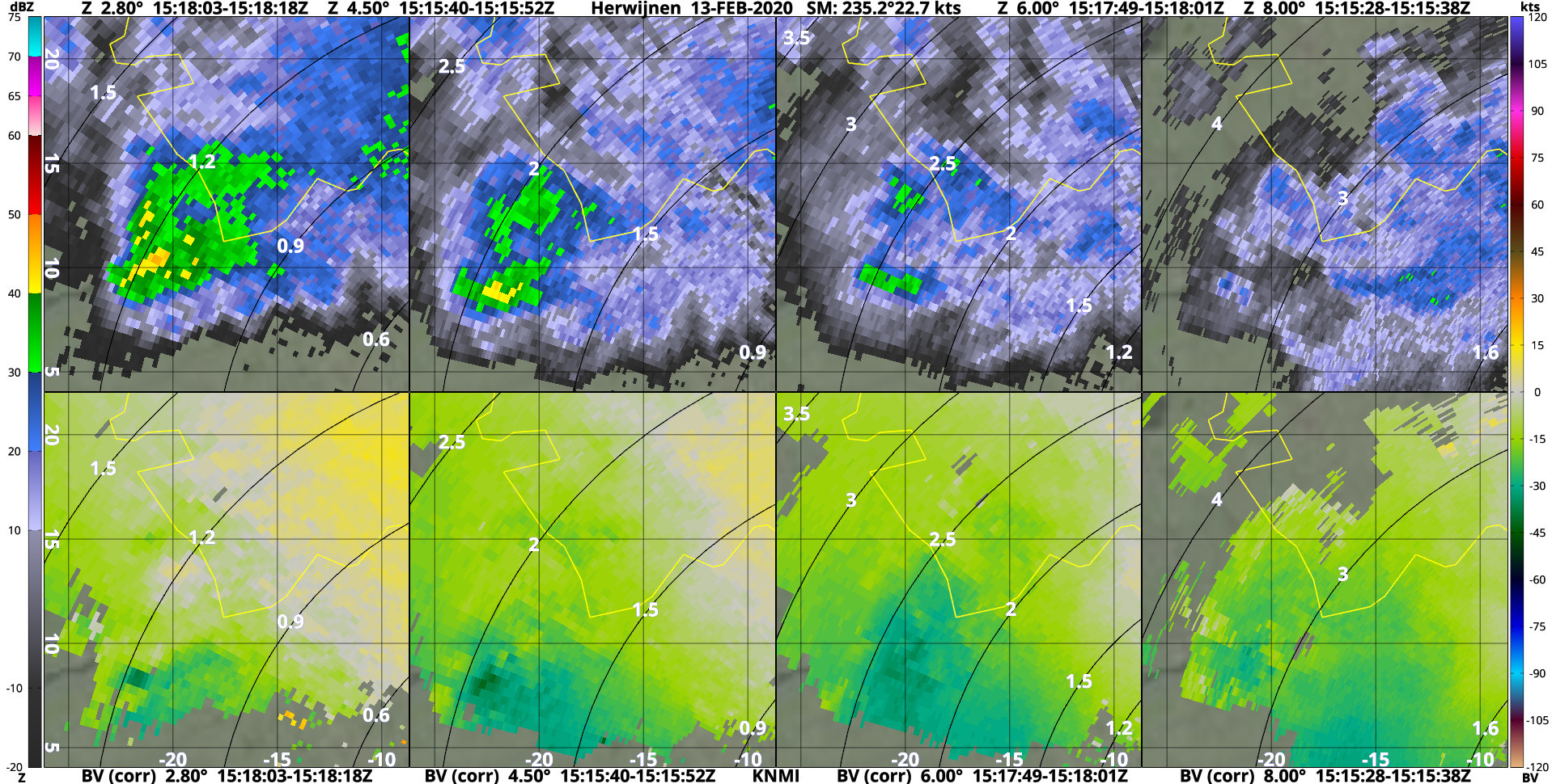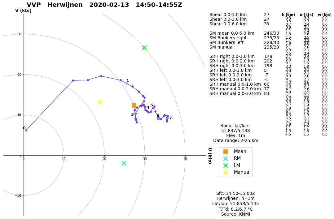 Het tweede plaatje toont een hodogram opgesteld op basis van dopplersnelheden gemeten door de radar in Herwijnen, en laat vrij hoge waarden voor de 0-1km Storm-Relative Helicity (SRH) zien met een redelijk gekromd hodogram. Verder lag de wolkenbasis met 200-300 meter op erg lage hoogte. In zulke omstandigheden (hoge 0-1km SRH met sterk gekromd hodogram en erg lage wolkenbasis) heb ik vaker gezien dat buien heel gemakkelijk low-level mesocyclonen ontwikkelen, en in sommige gevallen tornado's produceren.