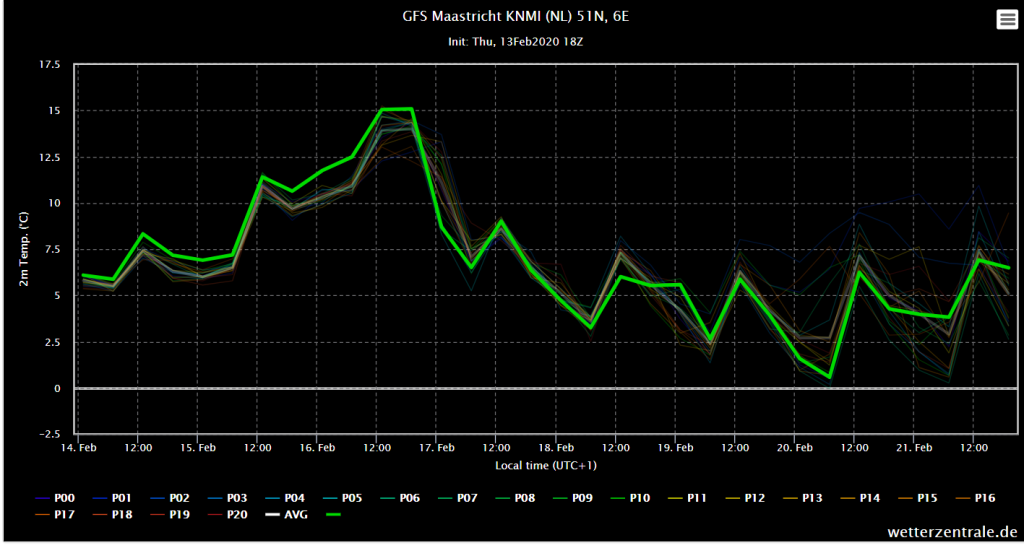 GFS 18Z oper Maastricht. Slechts erg tijdelijk extreem zacht