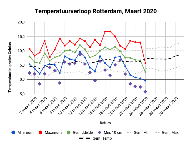 De koudste nachten van dit jaar staan nu op naam van 22, 23 en 24 maart (respectievelijk 0,7°C, 0,4°C en -0,4°C). Waarschijnlijk zal maart nog wel een paar extra nachten aanleveren die bij dit rijtje gaan horen.
