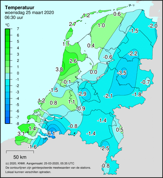 De Bilt naar -4.3°C en iets verderop geen vorst. Grote verschillen op