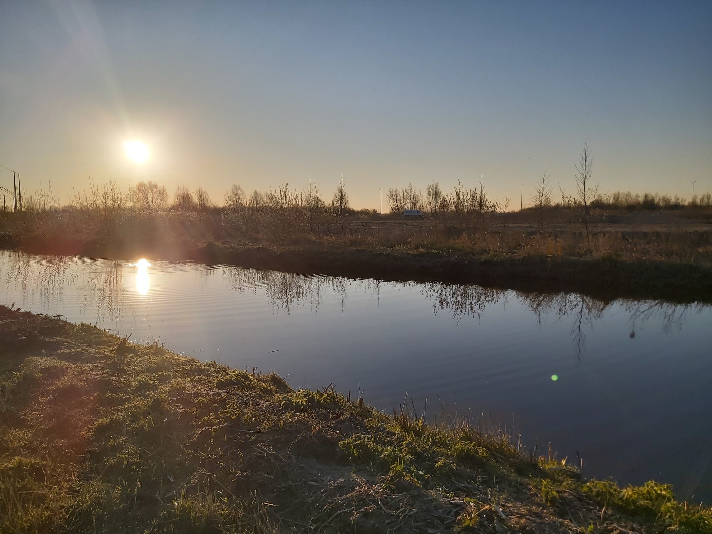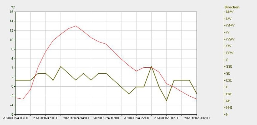 Door weinig wind grote verschillen tussen stad en platteland. Momenteel wat grondmist in de luwte van een rij struiken. Veel rijp op het gras, meer dan andere nachten.