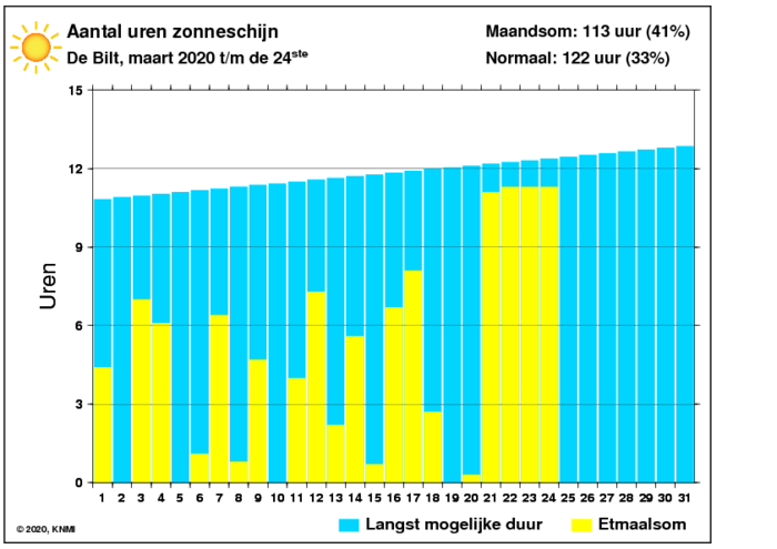 We staan tot en met gisteren op 113 uren, daar komt tot en met vrijdag nog zo'n 33 uren bij. Het totaal tot en met vrijdag zou dan op 146u uitkomen en dat is zo'n 11 uren onder een top 20 notering voor maart. Echter de maand duurt nog tot en met volgende week dinsdag, dus een top 20 notering (daarvoor > 157,6 zonuren nodig) lijkt bijna een zekerheidje met de huidige verwachtingen. Er is meer dan 174,2 zonuren nodig voor een top 10 notering, dat lijkt me wel iets te hoog gegrepen.