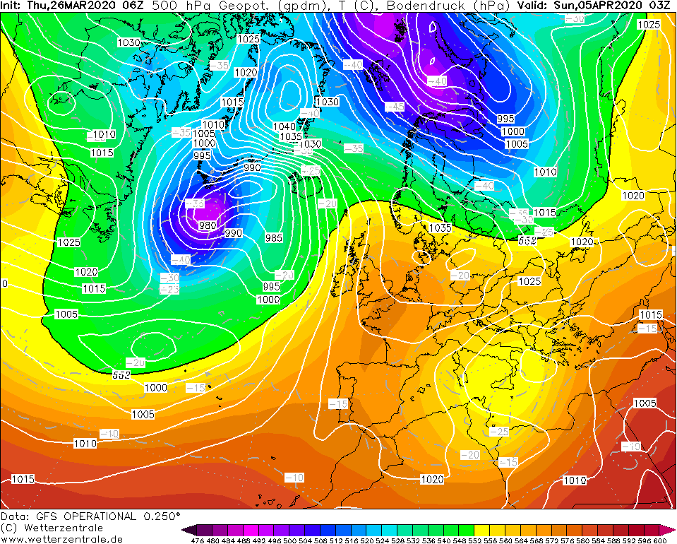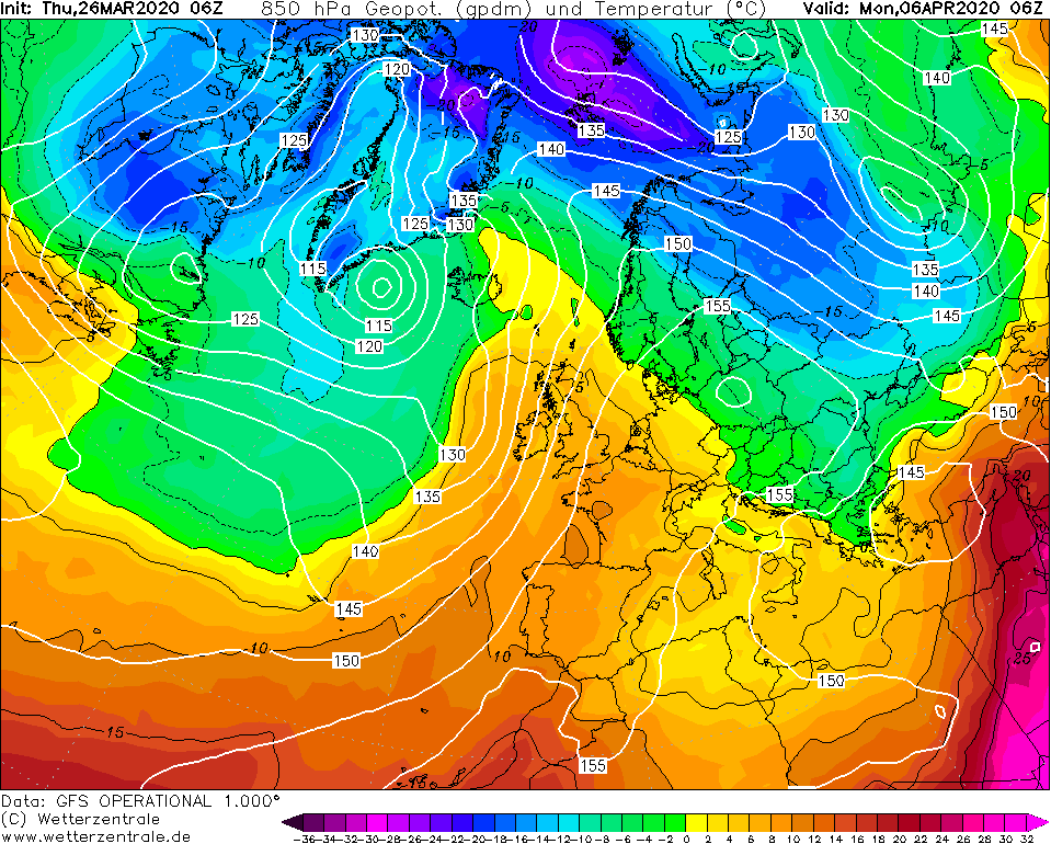 De 06z toont een nieuw scenario, namelijk geen glijbaan vanaf de noordpool, waar de vorige runs dat nog wel lieten zien. Maar een ontwikkelend hoog dat via onze omgeving boven zuid Scandinavië komt te liggen. Daarbij draait de zon weer overuren, en droogt de lucht weer uit wel is het zo dat er bij dit soort kaarten heel makkelijk een zuidstroming komt, door laag gelegen lagedruk, kan dus later voor warmte zorgen. Uiteraard onzeker, maar toch in de gaten houden.
