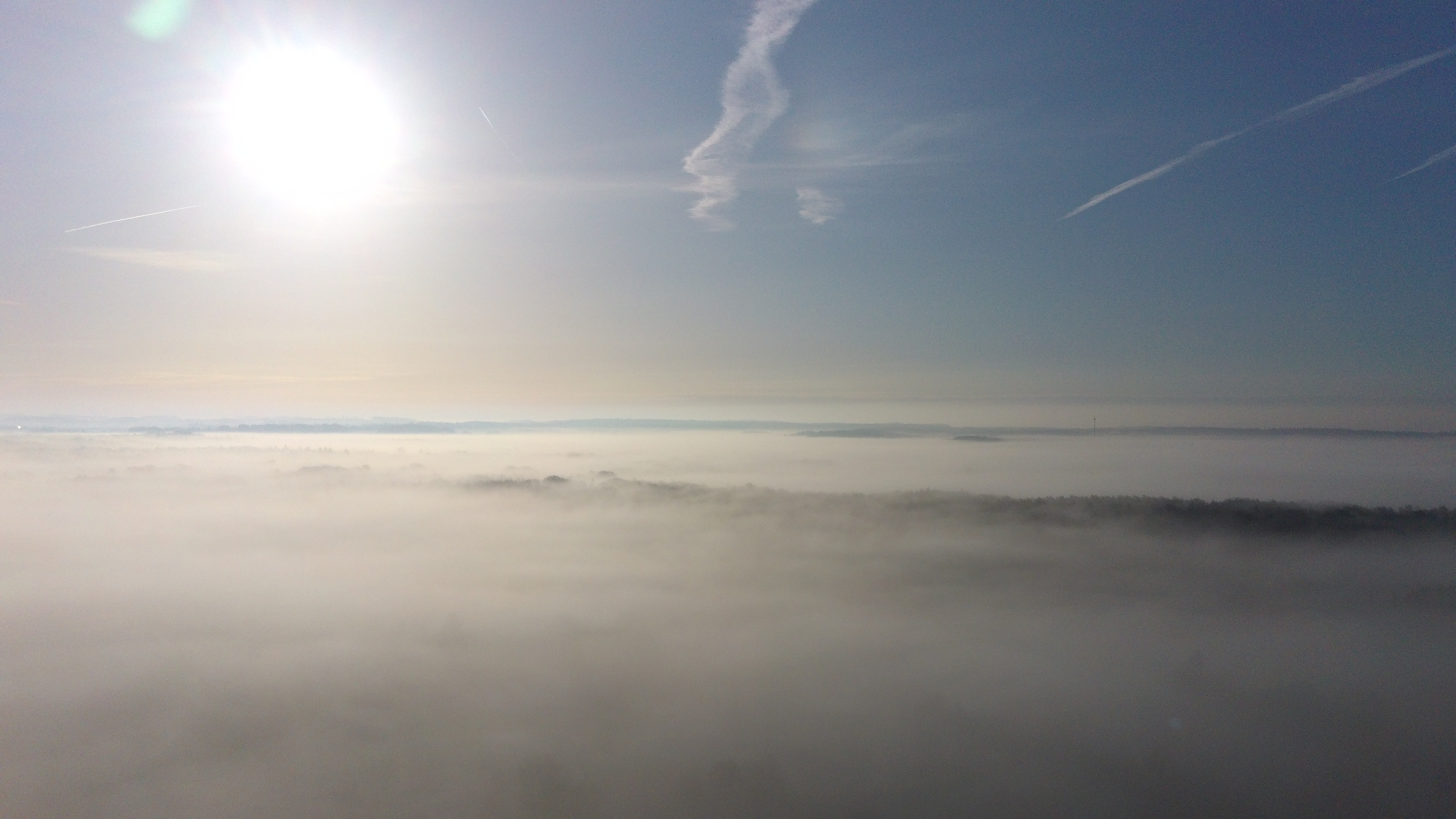 De zon komt al door de mist, geen dik pak mist (zo'n 30-40m). Daarboven prachtig zonnig. Enkele delen van het Heverleebos steken boven de mist uit. In de verte zie je het Meerdaalwoud, dat er ook bovenuit steekt.