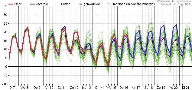 De oper+control met nog 3 andere lijntjes naar de 20°C, de rest zat een stuk lager. En kijk nu eens wat er met die zondag in 48u gebeurd is. Je gaat je bijna afvragen of die paar lijntjes die het helemaal niet zien zitten in een "koude" maandag en dinsdag over 48u ook in de meerderheid zijn... (ik denk het overigens niet