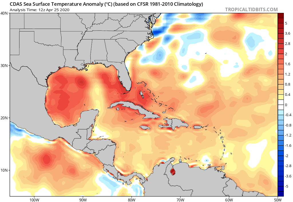 April 2020 temperatures across the Gulf Coast states from South Texas across southern Louisiana to South Florida are exceptional! The summertime-like temperatures and record warmth of the Gulf of Mexico. Numerous cities are smashing the all-time heat and average records. The blocking pattern and persistent high-pressure systems across the Gulf and southeast US have contributed to unprecedented record-breaking Florida heat lately. On Monday, the city of Miami experienced its hottest April day on record, peaked at a remarkable 97 degrees Fahrenheit (= 36.1 °C)!