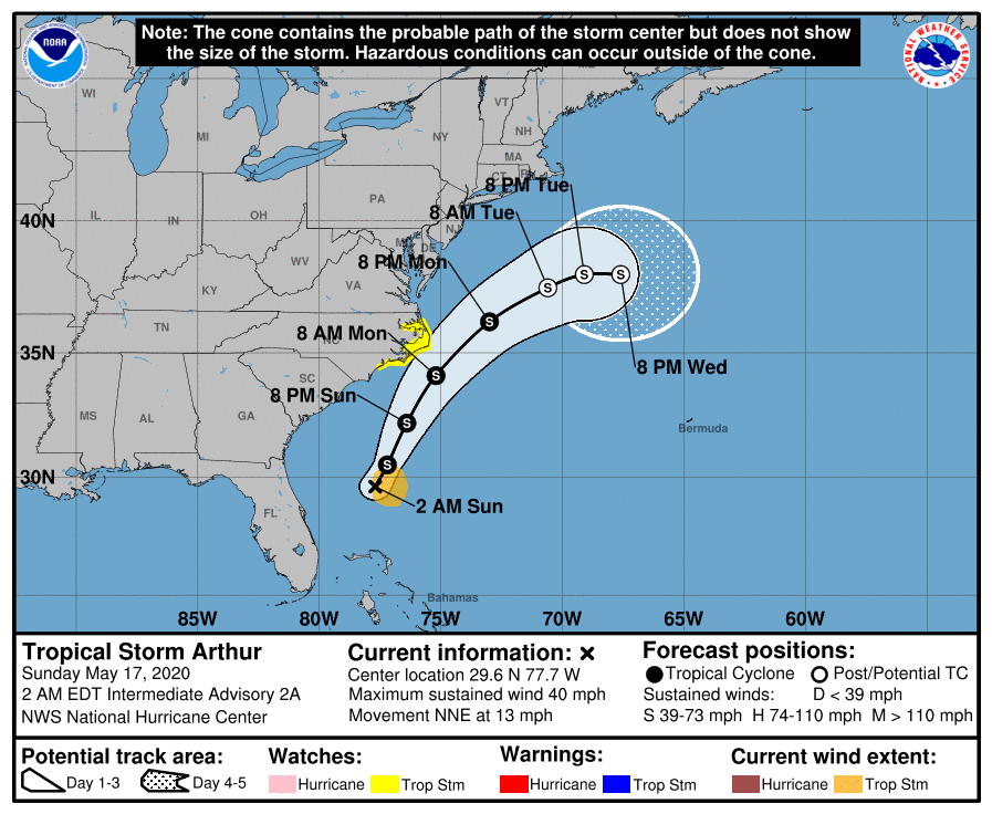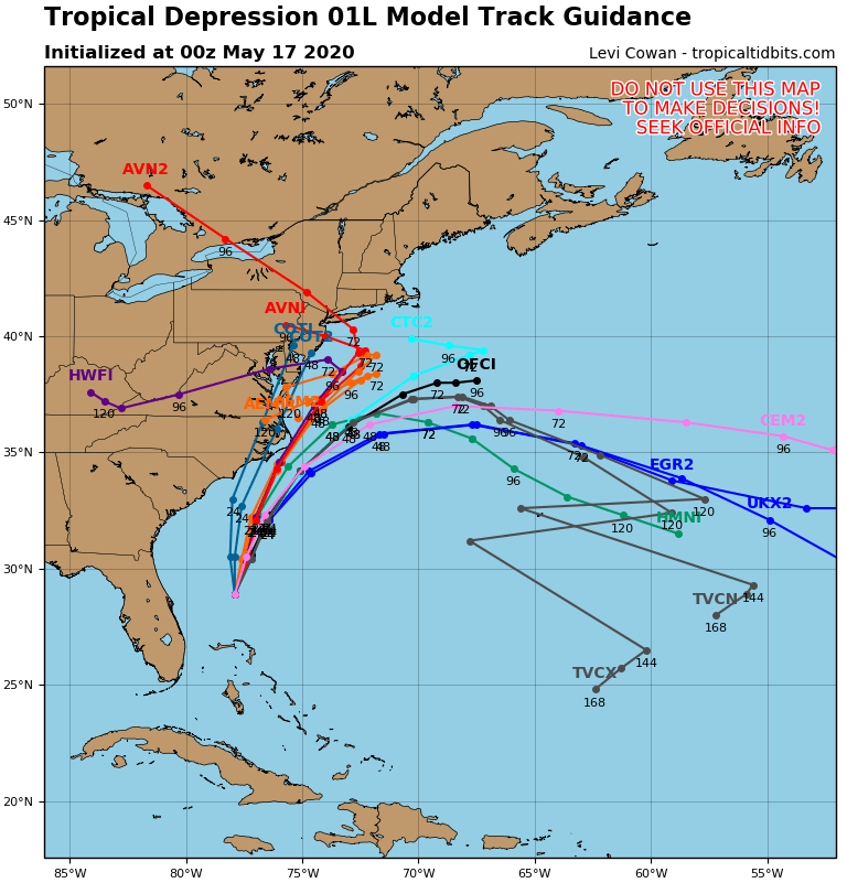 Terug naar Arthur. Hieronder is het huidige verwachte pad van Arthur te zien. Verwacht wordt dat Arthur een tropische storm blijft met, afhankelijk van welk model je kiest, windsnelheden van zo'n 90 - 100 km/h tijdens zijn piek over zo'n 60-72 uur. Er is nog steeds geen consensus in de modellen met een significant aantal leden in GFS dat niet naar de zee gaat, maar terugkrult righting de VS in de buurt van New York and Delaware. Maar op dit moment zijn die leden in de minderheid en gaat het nhc dan ook voor de meest waarschijnlijke optie dat de storm richting de zee krult nadat hij langs North Carolina scheert.