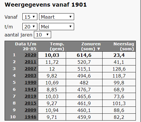 Bijzonder blijft toch ook de hoeveelheid zon vanaf 15 maart, bijna 100 uur meer zon dan de nr 2. Heel bijzonder.