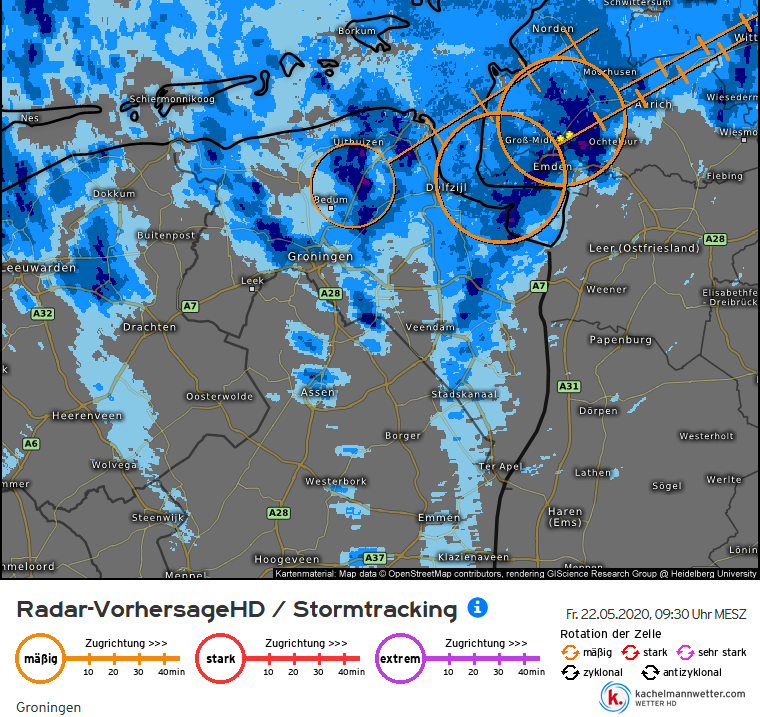 Ik bedacht ineens dat er een rightmover-signaal was, en bovendien was er een aangroei van de buien aan de zuidoostflank. Inderdaad zijn er nu ook cellen waarin rotatie wordt gesignaleerd volgens kachelmannwetter.