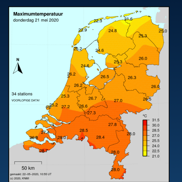 Gisteren was de maximumtemperartuur niet 26,3c in De Bilt maar 26,7c. (Slechts 0,3c van het dagrecord af) Dit zie je online nergens terug behalve op dit kaartje. Kan dit komen door de storing van gisteren?