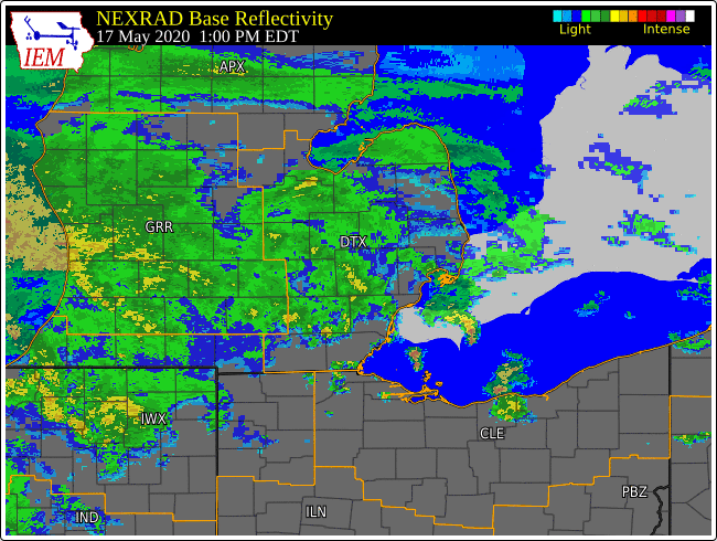 Daar kan het dus wel: in mijn mailbox vond ik een bericht over overvloedige regenval gedurende 48 tot 72 uur in het zuidoosten van de staat Michigan in de USA. Dat is tussen de grote meren, rond Detroit. Het gaat om de afgelopen dagen, van 17 tot 20 mei, en met name de 17e en 18e. In de link wordt een loop van zowat 48 uur weergegeven, met één radarbeeld per half uur en per seconde. De loop duurt dus ongeveer anderhalve minuut!