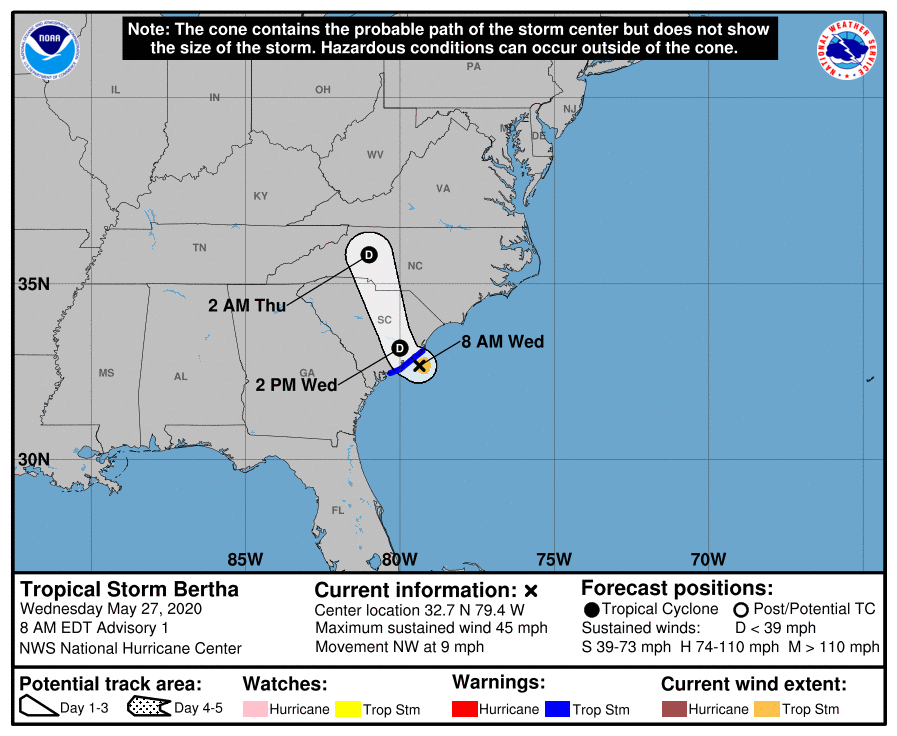 Het Atlantische orkaanseizoen is officieel nog niet eens begonnen en toch is hier alweer de tweede Atlantische tropische storm van het jaar, genaamd Bertha. Dit stormsysteem vormde zich langzamerhand ten Westen van Florida, trok toen als een groep zware buien over Florida en is daarna verder uitgediept tot een tropische storm. Het NHC ging ervan uit dat de shear te groot zou zijn voor het uitdiepen van de storm, maar binnen enkele uren is de storm zo snel aangesterkt dat NHC in eens van een '30% kans op stormvorming binnen 48 uur' opschaalde naar een tropische storm. Gisteren was er zelfs geen enkele waarschuwing op de NHC website gegeven over de mogelijke formatie van een storm. Aan de ene kant zou je misschien kunden denken dat het een beetje nalatig van NHC is (en daar zijn denk ik ook goede argumenten voor), maar aan de andere kant waren er ook zeker signalen dat shear een aansterking van de storm zou voorkomen en was het scenario dat nu is uitgekomen niet waarschijnlijk volgens de modellen. Hoe dan ook is de storm er nu en zal deze op dit moment aan land komen in South Carolina. Daarnaast lijkt het er ook op dat de werkelijke luchtdruk van Bertha lager is dan 1009 hPa. Een boei langs de kust meette net 1005 hPa en werd alleen maar geraakt door de Zuidelijke eyewall van de storm. Ook op basis van berichten op Storm2k, denk ik dat een druk van 1000 - 1003 hPa waarschijnlijker is.