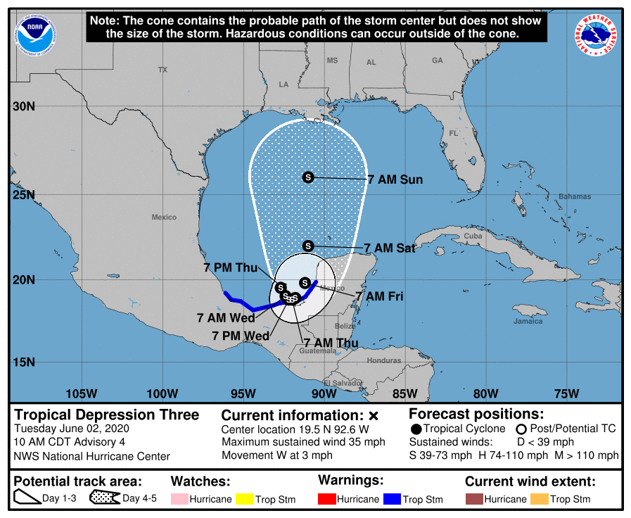Hieronder is het huidige verwachte pad van Cristobal te zijn volgens NHC. Zoals altijd in NHC vrij conservatief met de intensiteit van de storm. Dit komt denk ik vooral door het GFS model. Vrijwel alle modellen (ECMWF, ICON, UKMET, HWRF, CMC) laten de storm voor de grootste tijd op het water, met mogelijk een hele korte en minimale landfall boven Mexico de komende dagen, en sturen de storm daarna richting het noorden waar hij bij de meeste modellen aansterkt tot een krachtige tropische storm tot categorie 1 orkaan. ICON gaat zelfs voor een ruime categorie 2 orkaan en meerdere leden van ECMWF laten dit ook zien, wat laat zien dat het een serieuze mogelijkheid is. Maar GFS laat de storm rondtollen bij Mexico, waarna hij als zware tropische storm bij Mexico aan land komt. Vervolgens ontstaat uit de onstabiliteit daar nog een storm (dat zou dan Dolly zijn) en die gaat dan wel naar het open water van de Golf van Mexico. In dat laatste geval zou er sprake zijn van 2 stormen en zou Zuid-Mexico er ook een stuk meer problemen aan ondervinden met mogelijk gevaarlijke overstromingen, maar zouden beide stormen lang niet zo sterk zijn als de enkele storm die bij de andere modellen te zien is. Ik denk dat deze onduidelijkheid de belangrijkste reden is waarom het NHC nu nog een beetje conservatief is. Hier moet de komende dagen meer duidelijkheid over ontstaan.