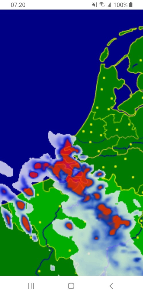 De patronen in de Harmonie uitvoer komen goed overeen. De bovengenoemde onzekerheid heeft er toe geleid dat het gebied waar een gele waarschuwing voor uitgegeven is, wat noordelijker ligt dan op grond van de Harmonie uitvoer gerechtvaardigd zou zijn. De buien zullen ontstaan bij de convergentiezone, die momenteel (03 UTC) boven het noorden van België en het uiterste zuiden van Nederland ligt. In het zuiden en westen zijn de voorwaarden voor diepe, actieve convectie gunstig, CAPE 1000-1500 J/kg en een grote waterinhoud, maar de enige forcering is lokale of wat grootschaliger convergentie in de grenslaag. De schering is 15-20 kn, in het uiterste zuiden nog wat meer. We krijgen vooral met multicellen te maken die (schijnbaar) stationair blijven als gevolg van (lokale) convergentie. Hagel is goed mogelijk in het (uiterste) zuiden. Cumulatieve neerslaghoeveelheden (6-uurlijks en 24 uurlijks) zijn lokaal tot ongeveer 40 mm. Plaatselijk valt meer dan 50 mm. Hoewel er verschillen in de uitvoer zijn, lijken de grote hoeveelheden voor het zuidwesten en zuiden te zijn, later in de avond kan noordelijk ook nog wel ergens 20 mm vallen, maar de cellen verplaatsen zich dan wat meer en de neerslag krijgt steeds meer een stratiform karakter (CAPE neemt sterk af, nog wat advectie van CAPE vanuit Duitsland). Donderdag ontwikkelt zich nog slechts een zeer lokale bui, CAPE dan rond 700 J/kg.