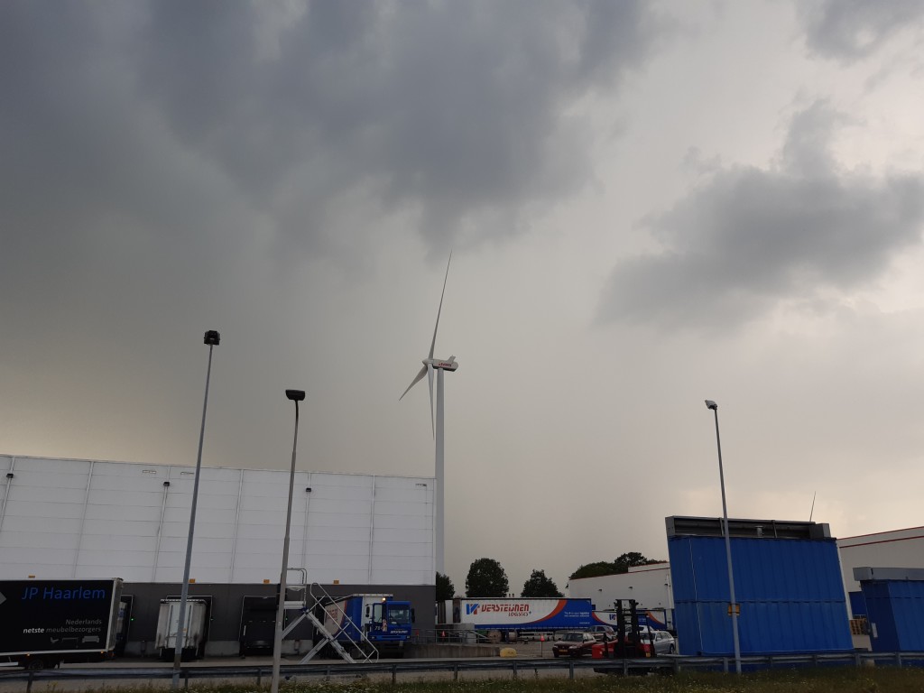 Wat een geweld. Harde inslagen i c.m. wolkbreuk achtige taferelen en zware windstoten. Ik en mijn collegas zijn er in deze bloedhete hal erg blij mee.