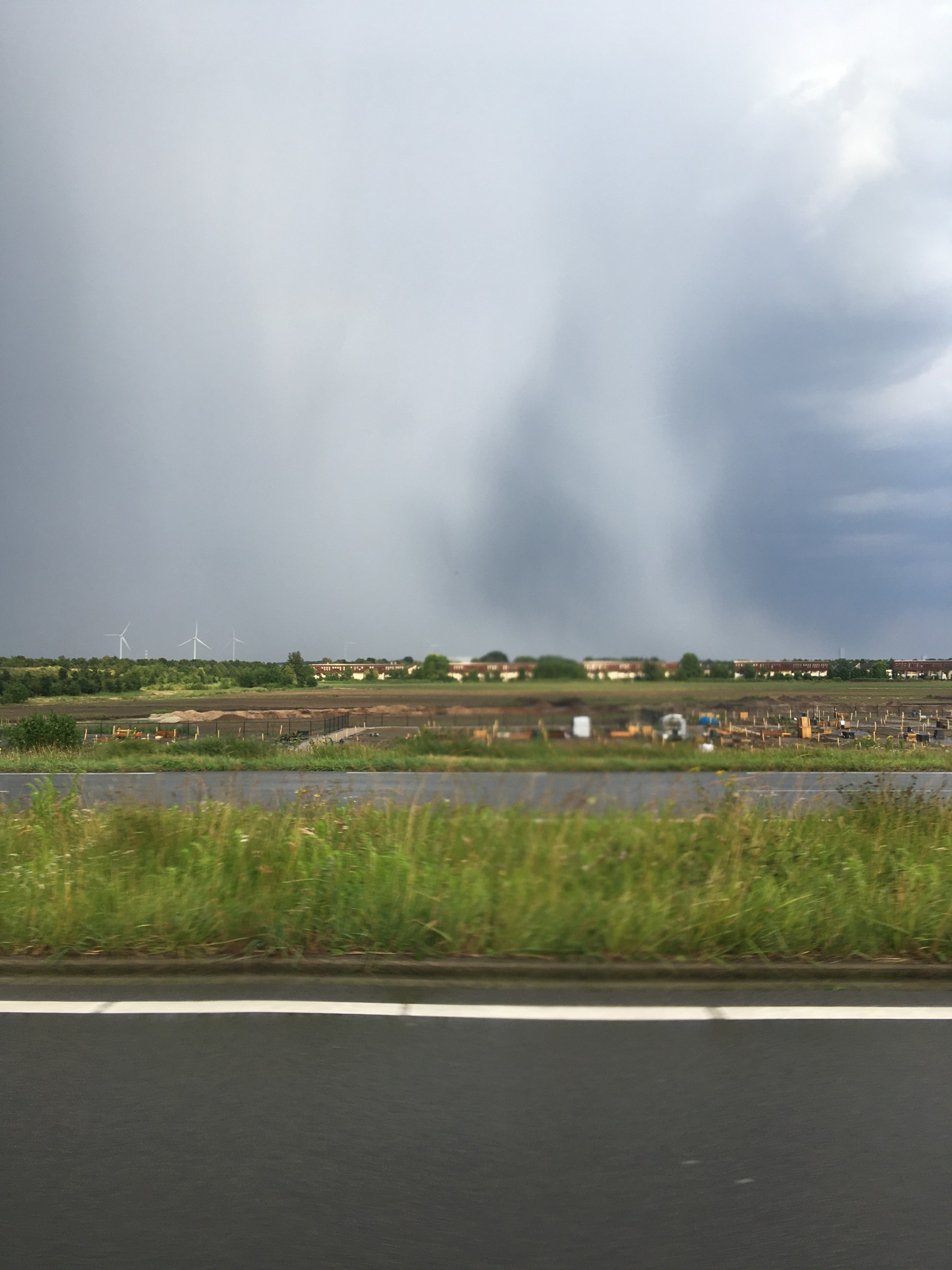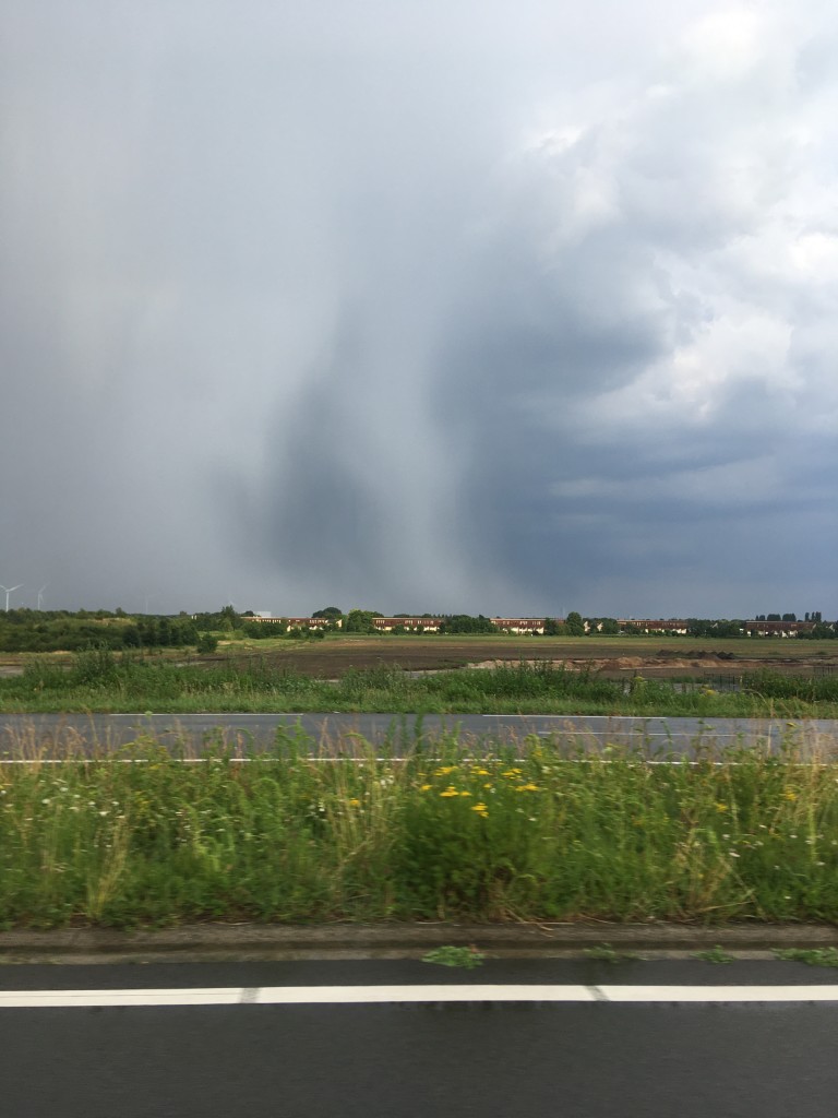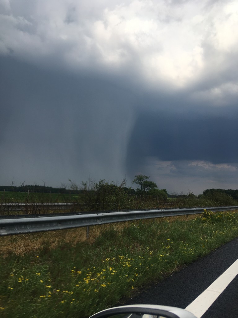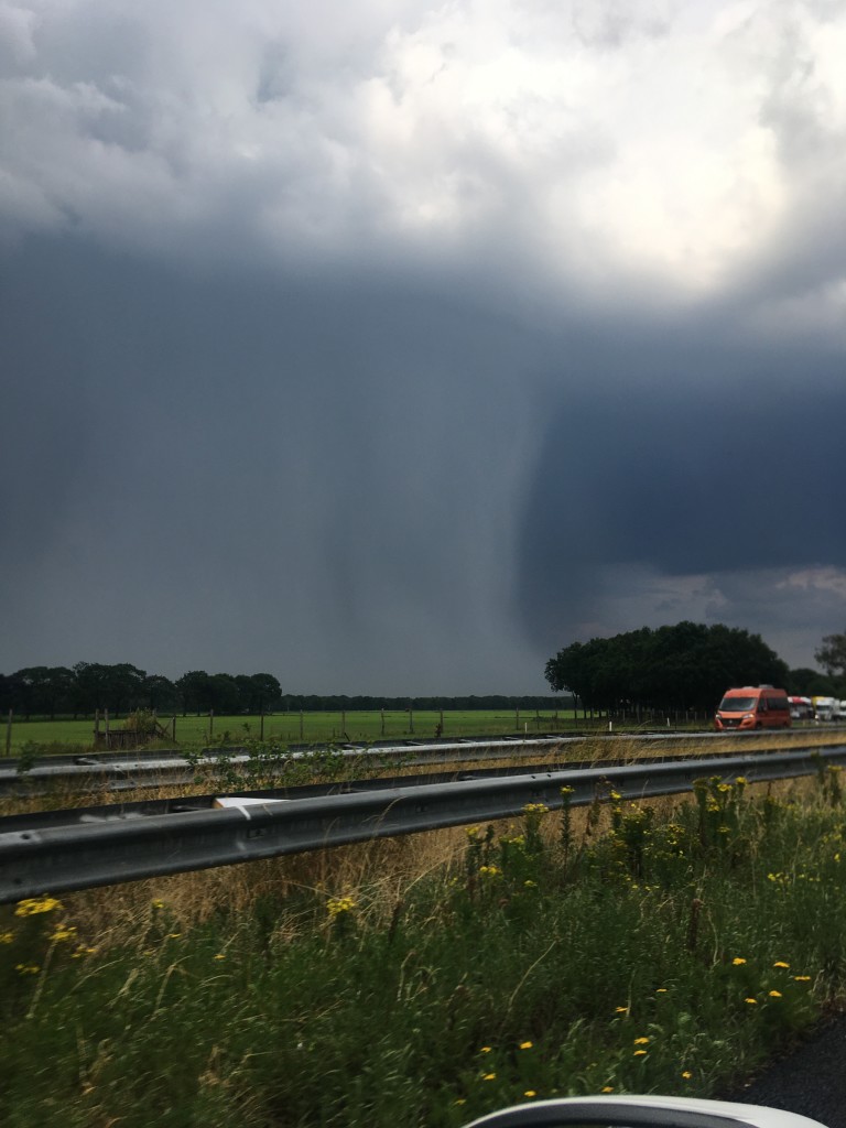 Ging HE-LE-MAAL los, downburst 1000 % takken waaiden overal van de bomen, zicht 20 meter, hagel van 2 cm ongelooflijk hard onweer flitsen, zat midden in de kern alles werd gewoon groen de lucht. Ik heb een foto van de bui van klein afstandje....