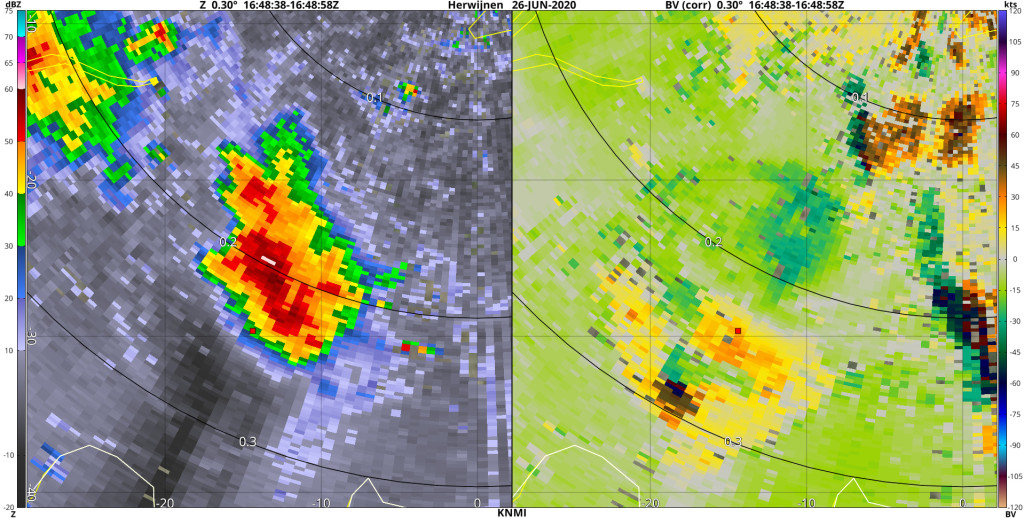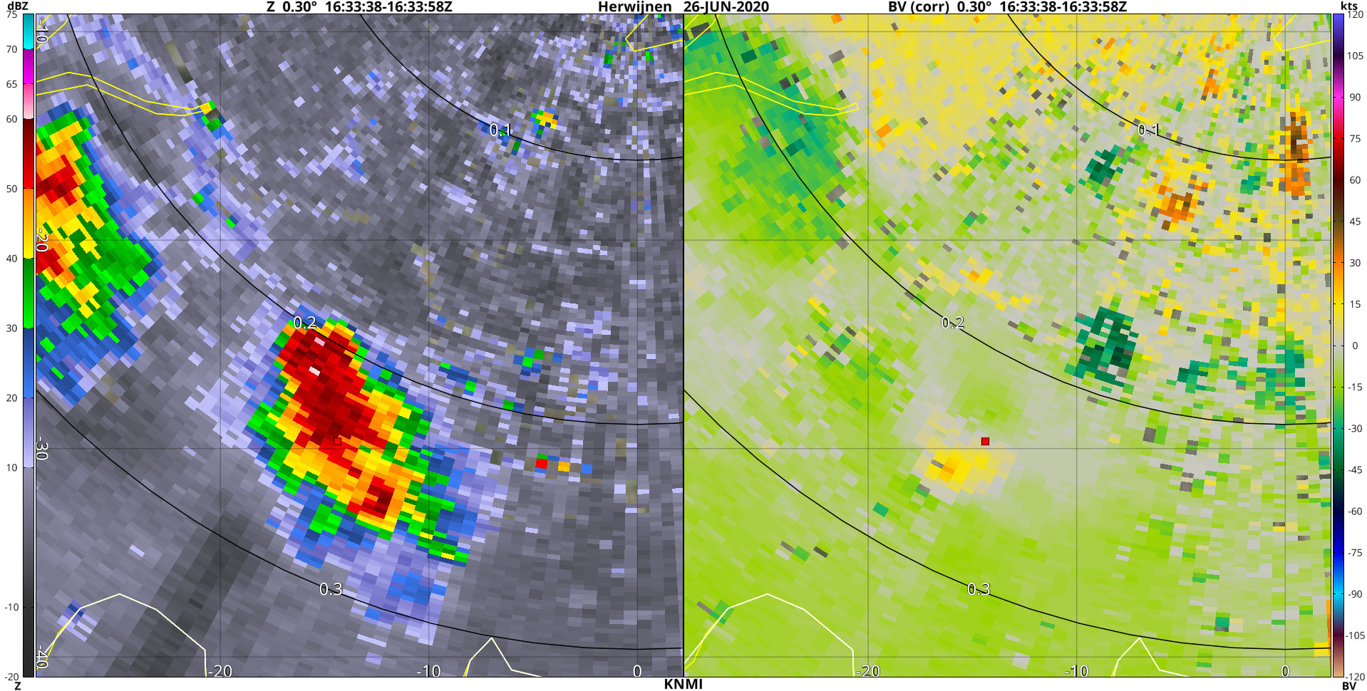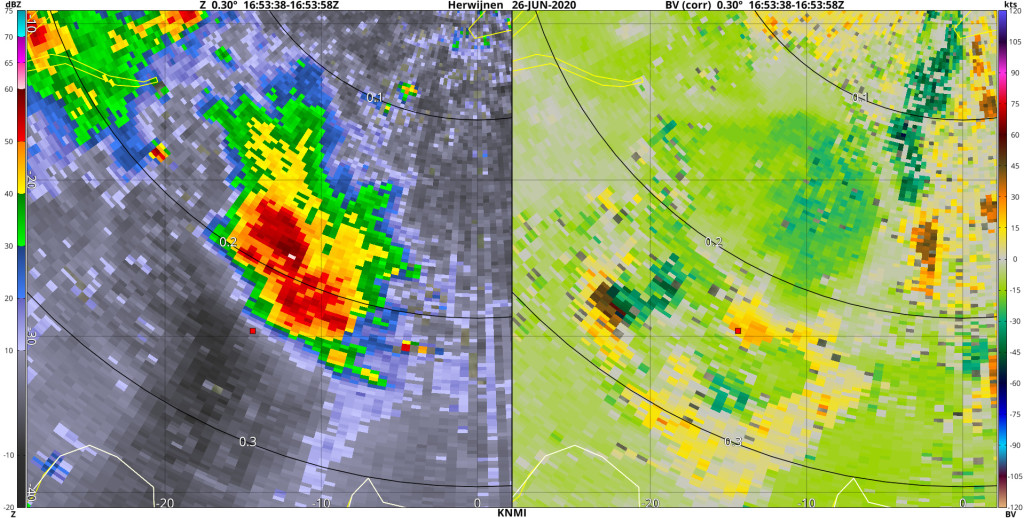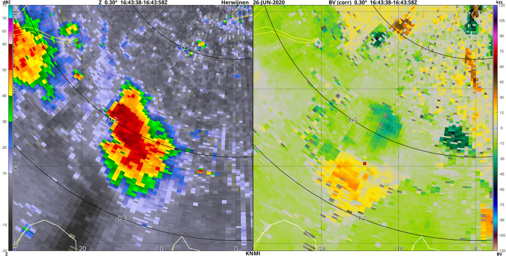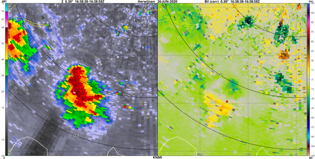 Met een redelijke outbound (van de radar afgerichte) radiële snelheid bij Gilze-Rijen (rode marker) tussen 18:40 en 18:50 toen die 88 km/h gemeten werd. Let ook om het mooie divergentiesignaal in de dopplerbeelden, altijd een mooie indicator voor dit soort downbursts.