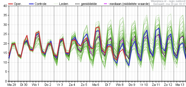 ECMWF run van deze morgen. Pluim geeft gemiddeld 25*C aan en de oper 26-27*C.