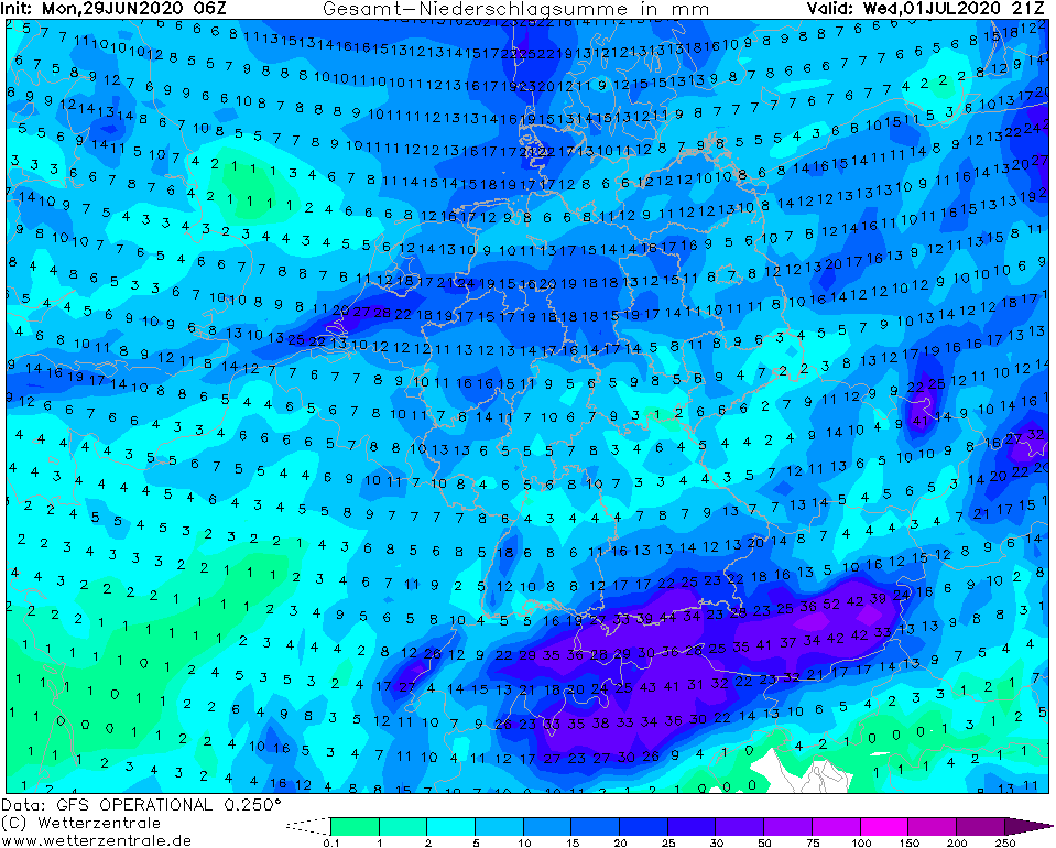 Bij de ingedraaide occlusie van tijd tot tijd regen in de noordelijke helft van de FIR, vanavond en komende nacht ook in het noordwesten en noorden van het land. De CAPE is verwaarloosbaar, behalve vanavond in het uiterste noorden van de FIR, daar 200-400 J/Kg. Dinsdagochtend nog wat lichte (buiige) regen in het noord(oost)en. Op nadering van het occluderende frontaal systeem perioden met regen, vooral in het midden en zuiden, in de middag en avond mogelijk wat buiig van karakter ten gevolge van inzaaiing. De positie van het neerslagmaximum is dus nog wel onzeker. Waarschuwingscriteria voor neerslag lijken deze periode niet aan de orde.