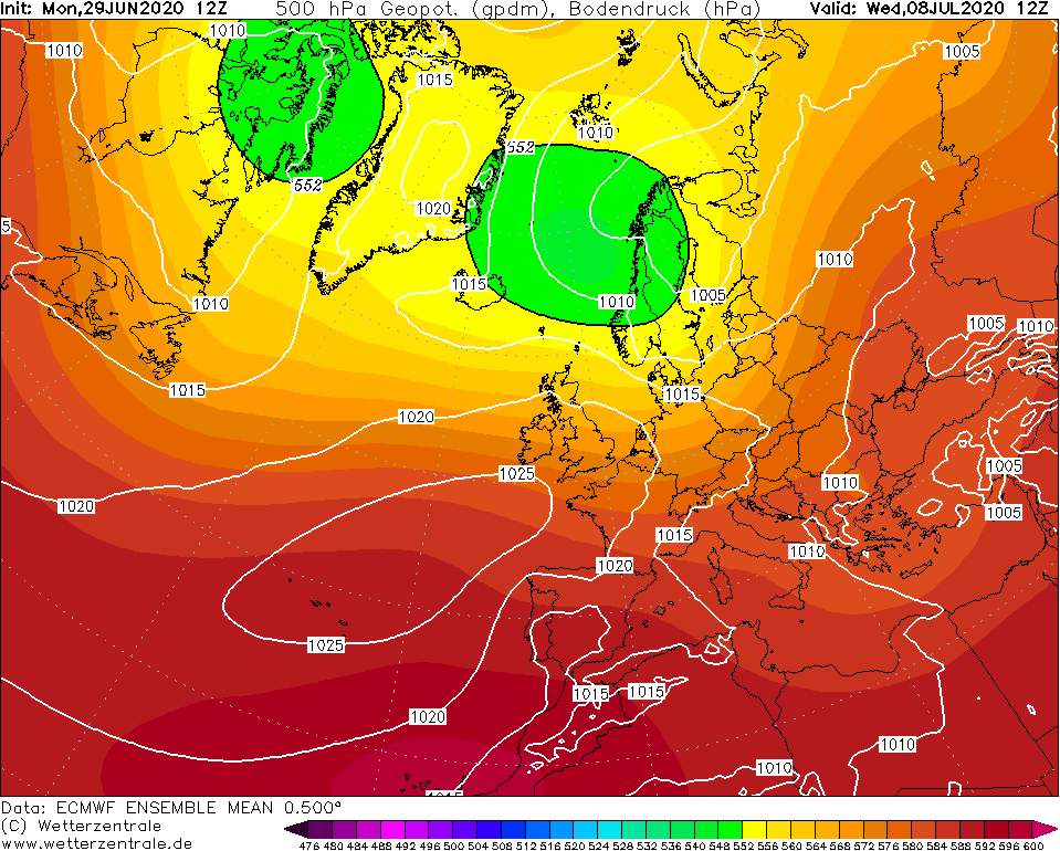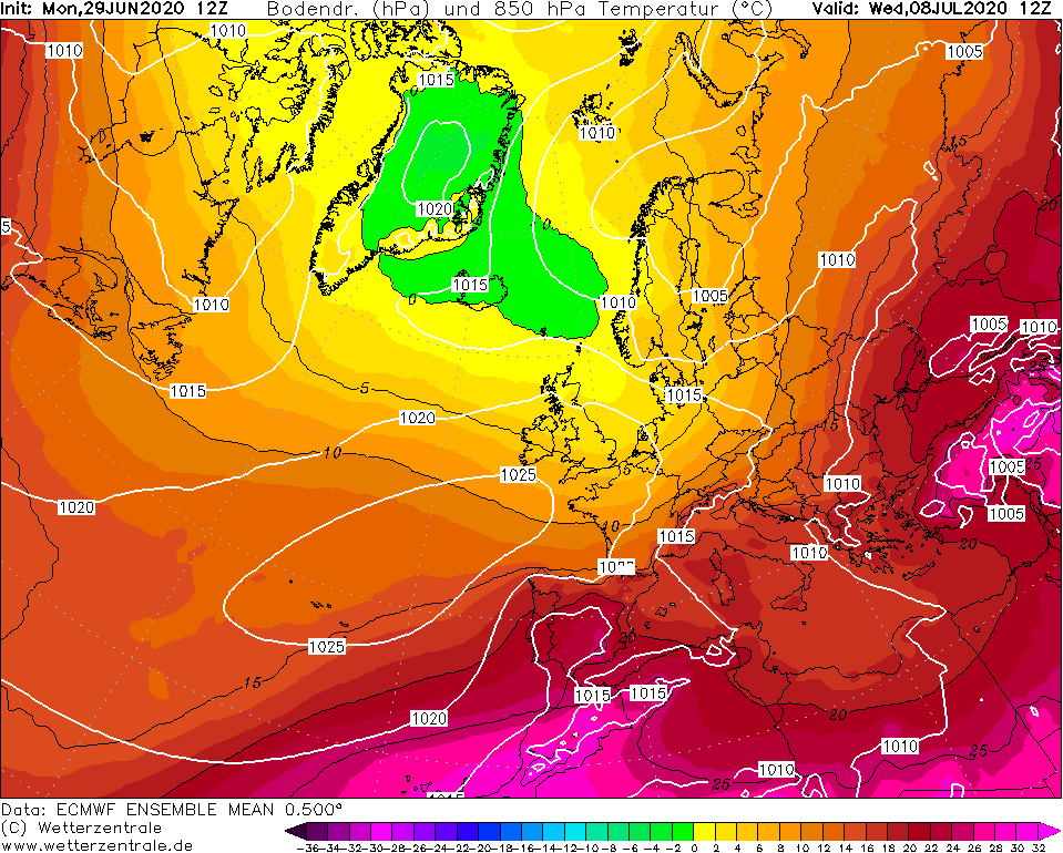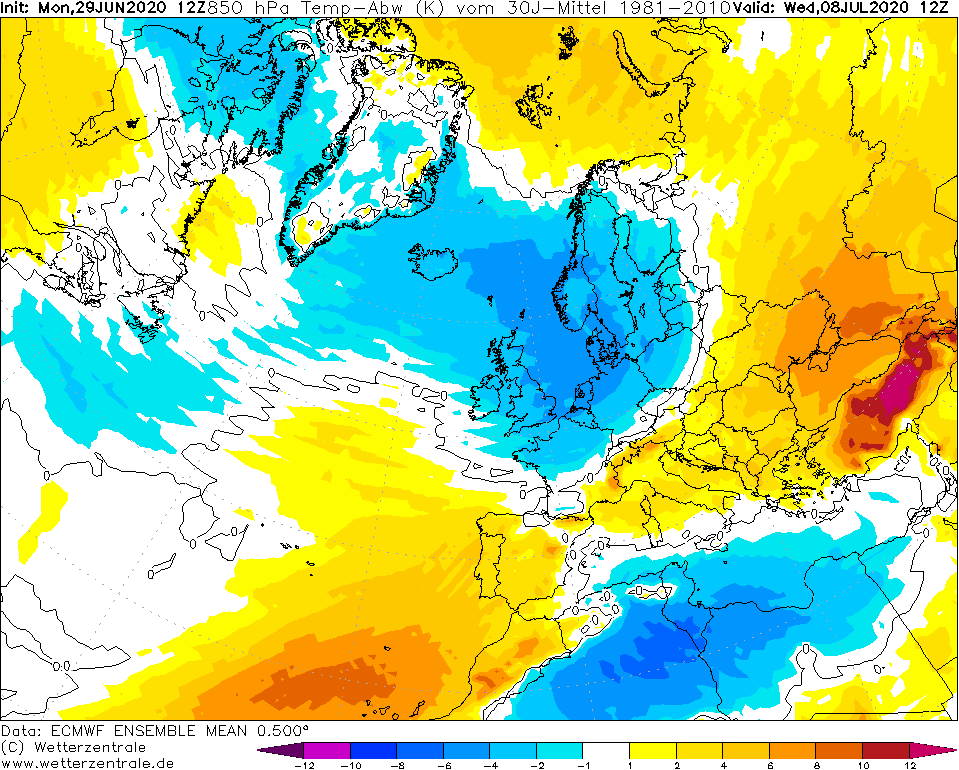 Niet alleen het GEFS is duidelijk omgeslagen van een overheersende uitloper van een Azorenhoog naar toenemende cyclonaliteit. De temperaturen liggen voorlopig rond tot iets onder normaal. Vanaf vrijdag enkele graden hoger, maar na het weekend is er een vrij 'bijzondere' overtuiging binnen het EPS. Met een noordwestelijke stroming gaan de temperaturen dan opnieuw omlaag, gemiddeld gezien waarschijnlijk nog een stukje lager dan deze week. Voor woensdag 8 juli ligt de temperatuur op 850hPa op gemiddeld 3 tot 5 graden. Als je daar 13 à 14 graden bij optelt, kom je uit op maxima van 16 tot 19 graden midden volgende week. Natuurlijk nog ver in termijn, maar het ziet er wel vrij overtuigend uit (evenals het GEFS).