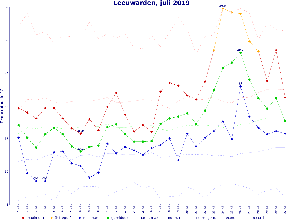 Hier de grafiek van Leeuwarden. En ik kan me prima voorstellen dat juli 2019 in Friesland nauwelijks indruk maakte, als je die hitte (die vrij plotseling kwam) even wegdenkt. Vijftien dagen met maxima onder de 20 graden he?