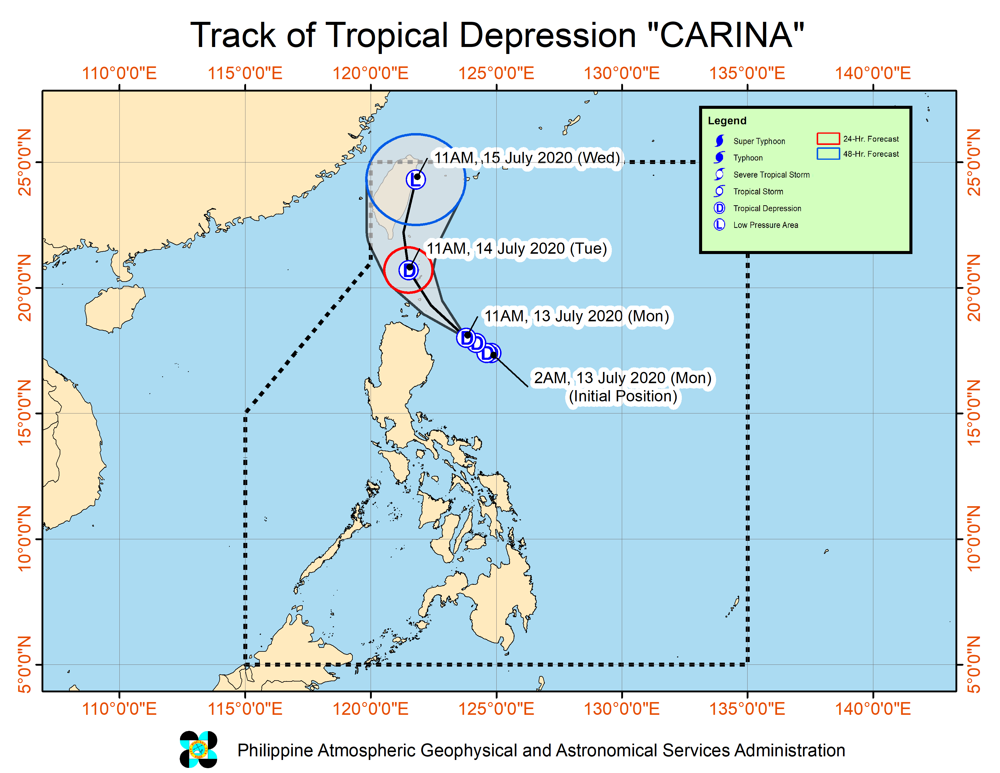 Het Pacifische typhoonseizoen, normaal gesproken met afstand het meest actieve stormseizoen op aarde, is tot nu toe verrassend rustig. Na bijna een maand zonder storm is vandaag een nieuwe tropische depressie tot stand gekomen, genaamd Carina. De depressie zal naar het Noordwesten bewegen en over 2 dagen als zwakke tropische depressie aan land komen bij Taiwan. Althans dat is de verwachting van het PAGASA instituut, GFS is er nog niet zeker van en laat bij veel leden de storm alleen langs Taiwan scheren om vervolgens richting Japan te trekken, waarbij de storm in sommige extreme leden uitdiept tot zo'n 990 hPa. Hoe dan ook zal de meeste regen door Carina de komende dagen in het Noorden van de Filipijnen vallen, waar je lokaal tot zo'n 150 mm kan verwachten de komende 24 uur.