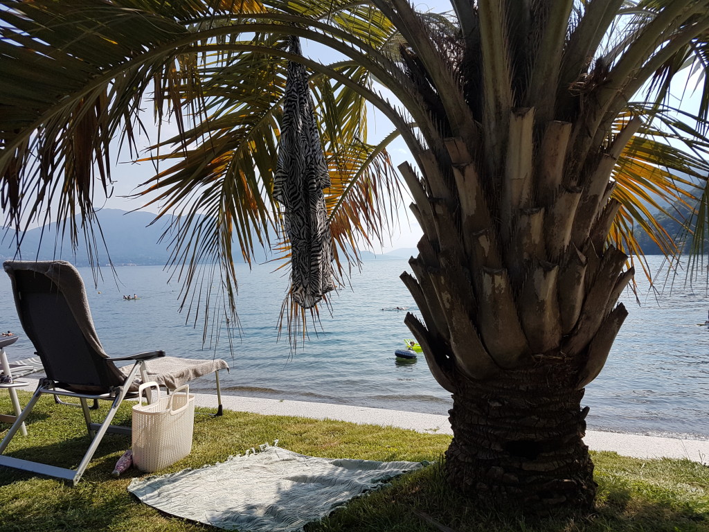En ik maar denken dat het in Cannobio warm is met 30 C. Net een korte onweersbui gehad, nu weer zon en vochtig. Niet echt mijn favoriete weertype. Ik heb me verstopt onder een palmboom in Cannero Riviera.