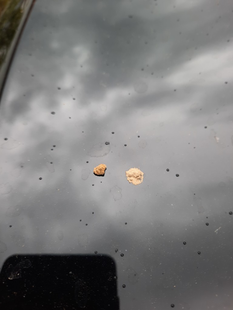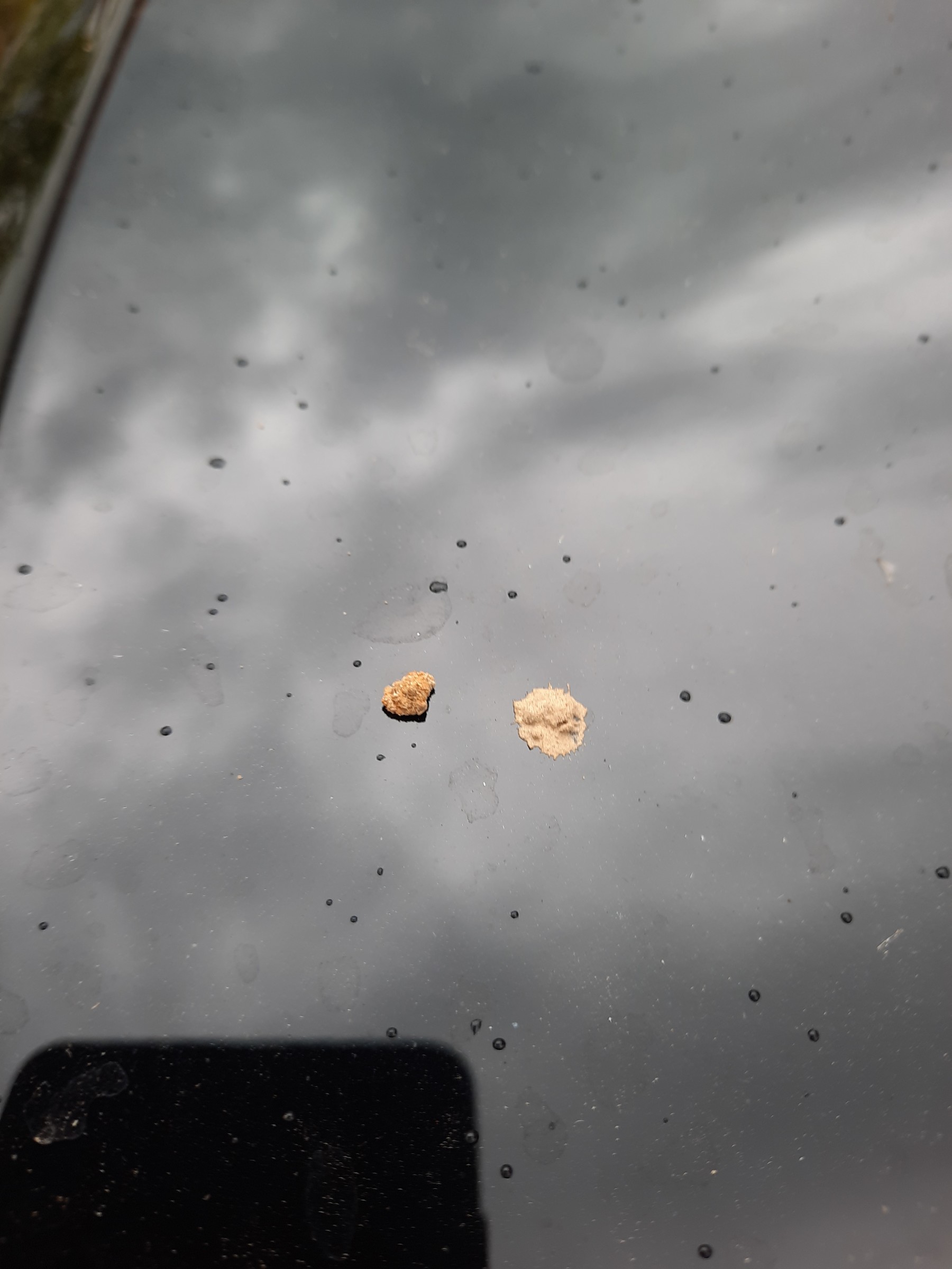 het was me al opgevallen, maar ik dacht dat het een soort vogelpoep was. Het is alleszins zeer hardnekkig op de auto.