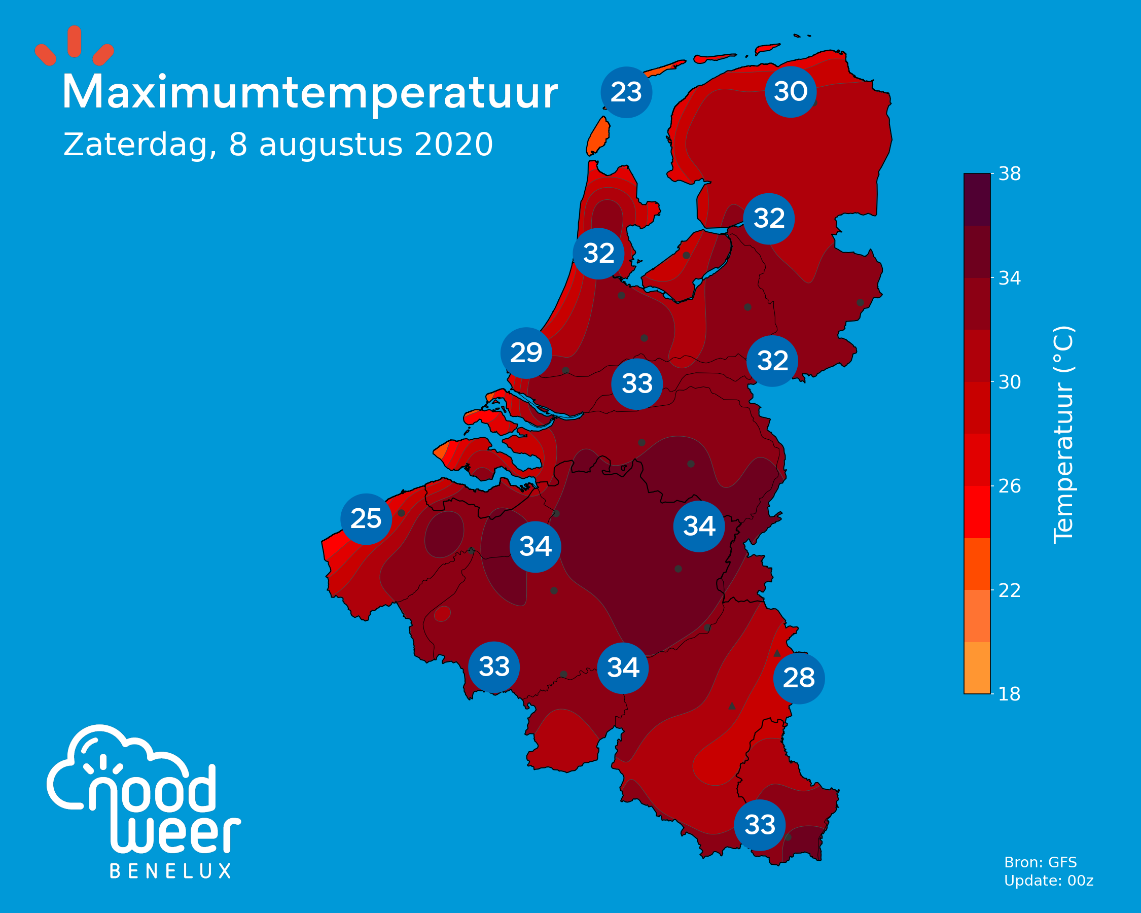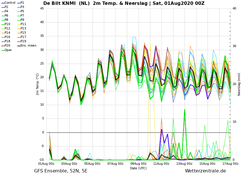 Voor het midden van Nederland dan. Voor De Bilt komt het gemiddelde uit op 30 graden, maar daar zit nog niet de maximumtemperatuur en/of MOS-correctie bij. Dan kom je toch al gauw uit op een 32 à 33 graden. De OPER zit bijvoorbeeld ook in het midden en komt met de volgende maximumtemperaturen.