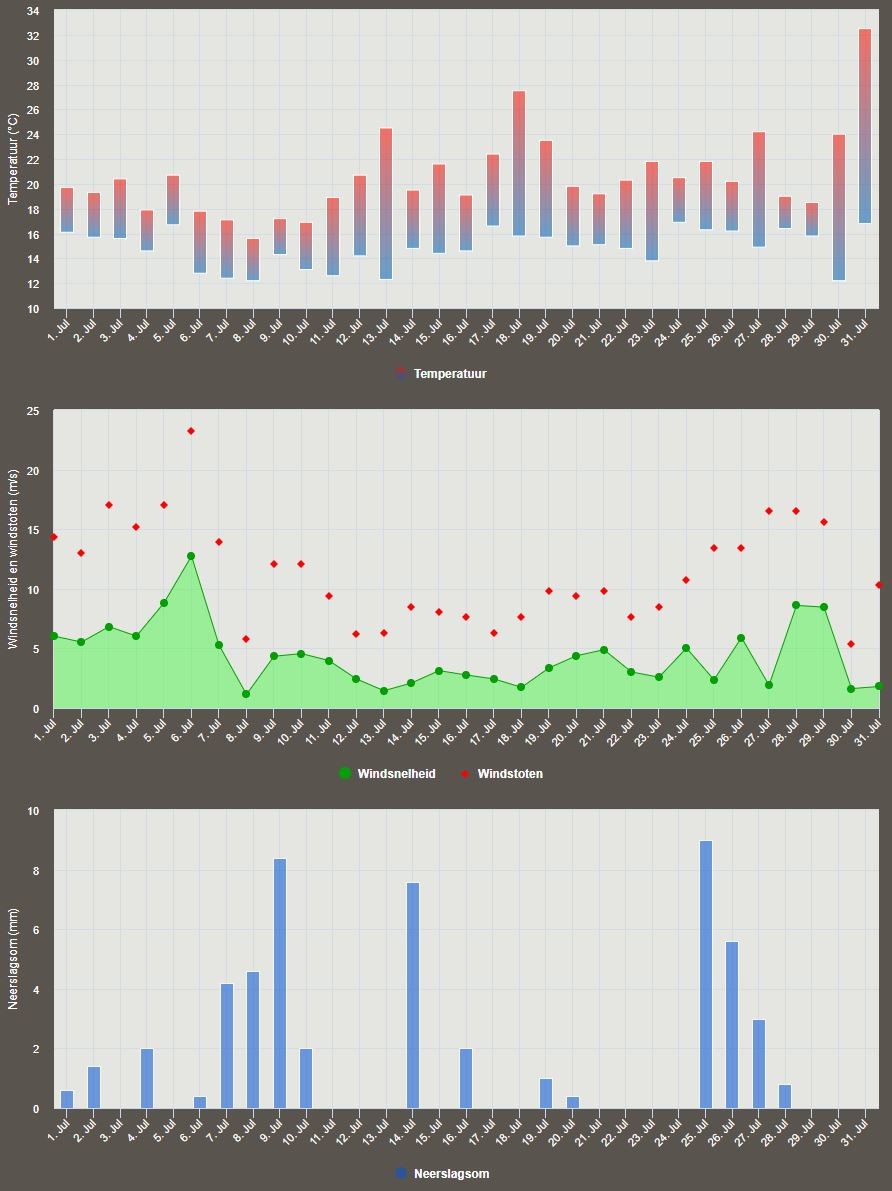 In vergelijking met vliegveld Lelystad was juli hier 0,6 graden warmer. Dat komt vooral door de hogere minima, dankzij de nabijheid van het Markermeer.