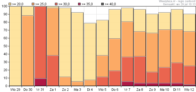 Zie hier de kansstaafjes van afgelopen woensdag 29 juli 00Z run voor de regio zuidoost, 10% kwam met 35°C (in de 12Z run werd dit 15%). Het werd uiteindelijk 35°C te Arcen en 36,2°C te Maastricht, Ell zal ik vanwege het gesproei maar even buiten beschouwing laten.