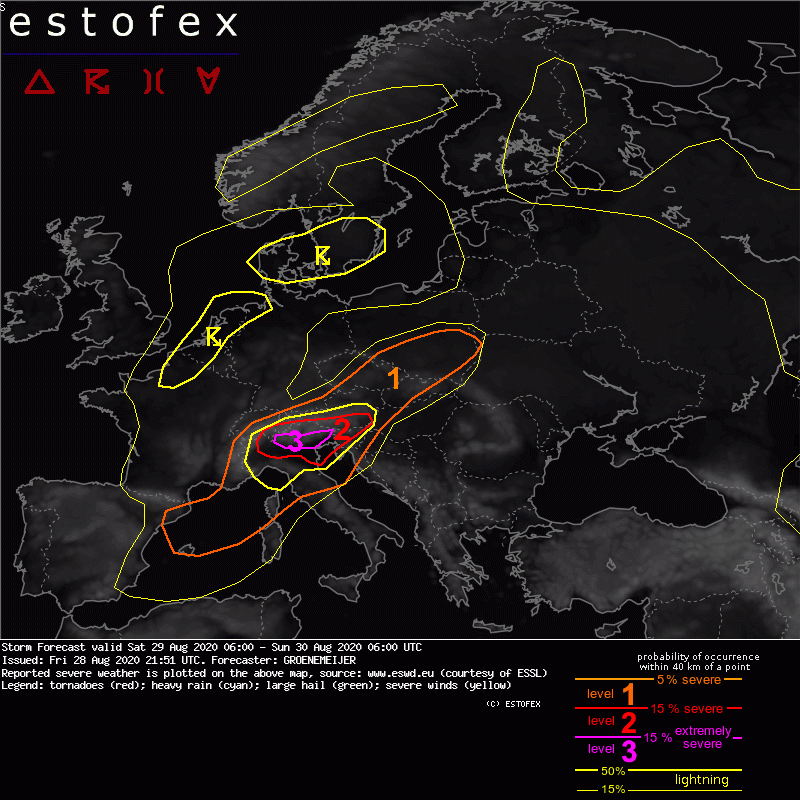 hoogste waarschuwingsniveau voor potentieel zware tornado's, grote hagel en extreme hoeveelheden neerslag. www.estofex.org