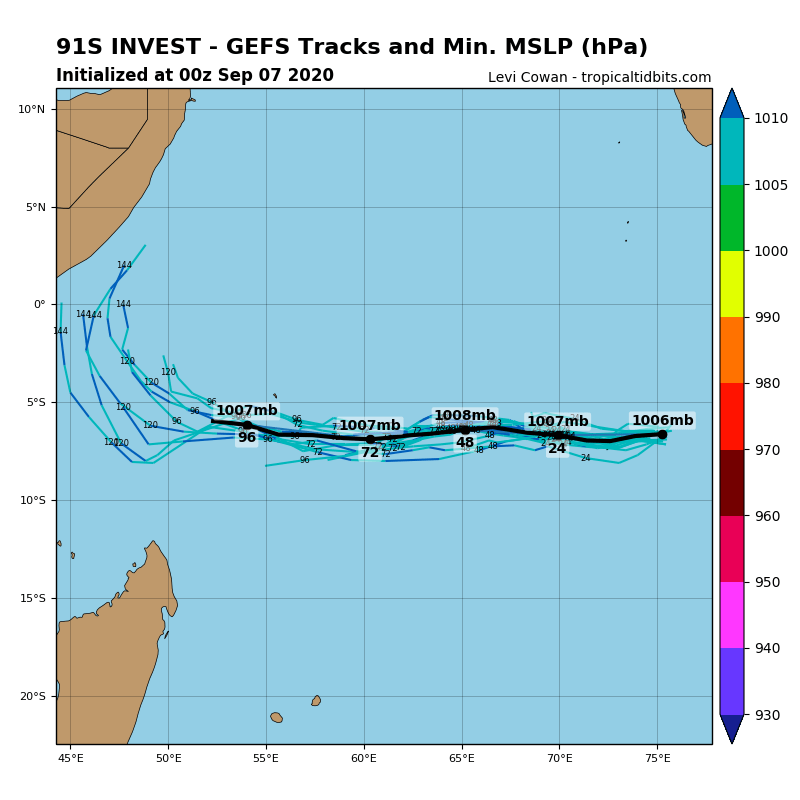 Als laatste nog een ongebruikelijke disturbance ten Oosten van Tanzania. Hoewel het Zuidwest-Indische (lees = Afrikaanse Oostkust) seizoen normaal pas in november begint, is er nu al een disturbance die mogelijk een tropische depressie kan worden. De vormingskans hierboven is gebaseerd op de recente GFS en GFS-para runs. De komende dagen zal het systeem verder naar het Westen bewegen. Een zwaardere tropische storm of cycloon wordt niet verwacht. De modellen lijken nu net voor een mogelijke landfall weg te krullen, maar de EC en GFS runs laten wel zien dat er lokaal langs de kust van Zuid-Somalïe en Noord-Kenia misschien wel meer dan 70 mm regen of meer kan vallen en zelfs in het binnenland tot 30 mm. Dat is voor de kust niet heel bijzonder, maar in het binnenland van Kenia valt, op plekken waar nu regen wordt ingetekend, gemiddeld 2 mm regen in september en kan dit dus een bijzondere regenbui worden.