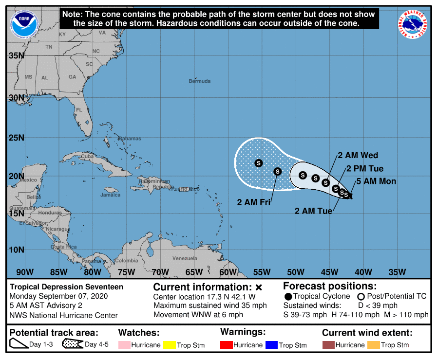 Tot vanochtend waren er 4 disturbances in de Atlantische Oceaan, maar twee daarvan werden een paar uur geleden officieel tropische depressies. De eerste daarvan, TD-17, zal waarschijnlijk binnenkort een tropische storm worden en zal de komende dagen naar het Westen bewegen. Rond vrijdag kan de storm een dipje naar het Zuiden maken, maar het is nog niet zeker hoe groot die dip echt gaat worden. Beide disturbances hebben een relatief kleine kans op de Caribische Eilanden of de VS te raken, maar van de 2 is de kans bij TD-17 iets groter. Sommige van de meest Westelijke leden komen vrij dicht in de buurt bij de Dominicaanse Republiek. Maar vooralsnog denk ik dat de kans klein is dat deze leden uitkomen. Nu ik erover nadenk is het misschien wel handig voor Bermuda om de storm in de gaten te houden als die echt zo Noordelijk komt. Gelukkig laat geen van de modellen nu een sterk signaal zien voor orkaankracht.