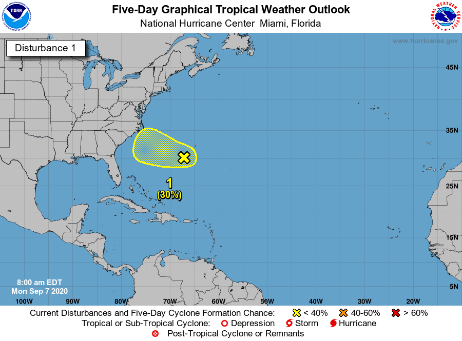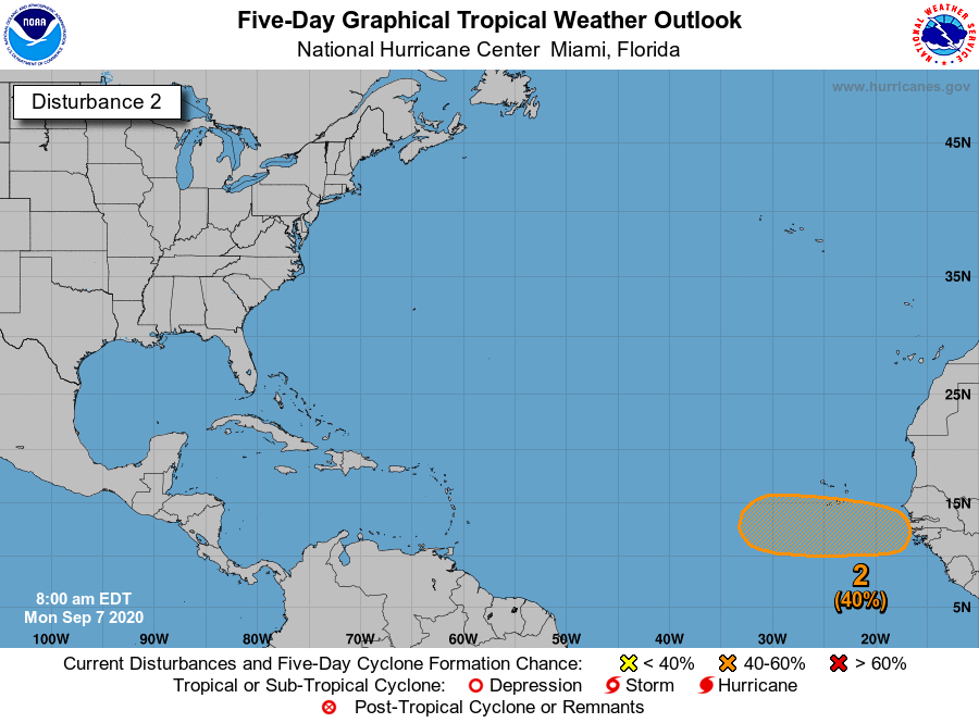 Daarnaast zijn er dus ook nog 2 disturbances. De eerste disturbance bevindt zich ten Zuidwesten van Bermuda en zal de komende dagen langzaam naar het Westen bewegen. Stormvorming is mogelijk, maar schat ik om eerlijk te zijn redelijk laag in. In de laatste GFS run komen maar enkele leden net tot een storm en zelfs in de ICON run, waar de storm wel duidelijk vormt, wordt hij nooit sterker dan 1003 hPa. Hoe dan ook kan ook een zwakke storm veel regen met zich meebrengen en dus is het wel handig voor de Oostkust om het met een schuin oog in de gaten te houden.
