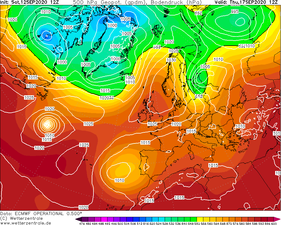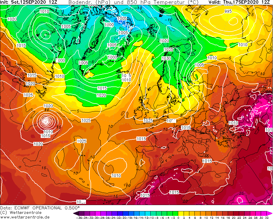 Er komt teveel koudere lucht omlaag met het hoog zoals dat door EC wordt geprognosticeerd. Daardoor donderdag op veel plaatsen 'slechts' 15 - 20 graden lijkt mij. Daarna draait de wind weer naar zuidoost maar ondertussen is de koelere lucht dan al heer en meester waardoor het echt niet meer zomers kan worden. Hittegolf gaat er op deze manier dus niet komen, ook niet regionaal.
