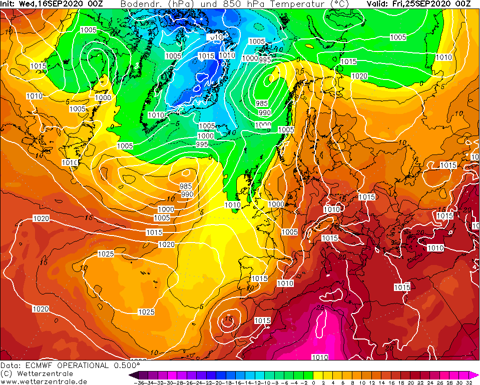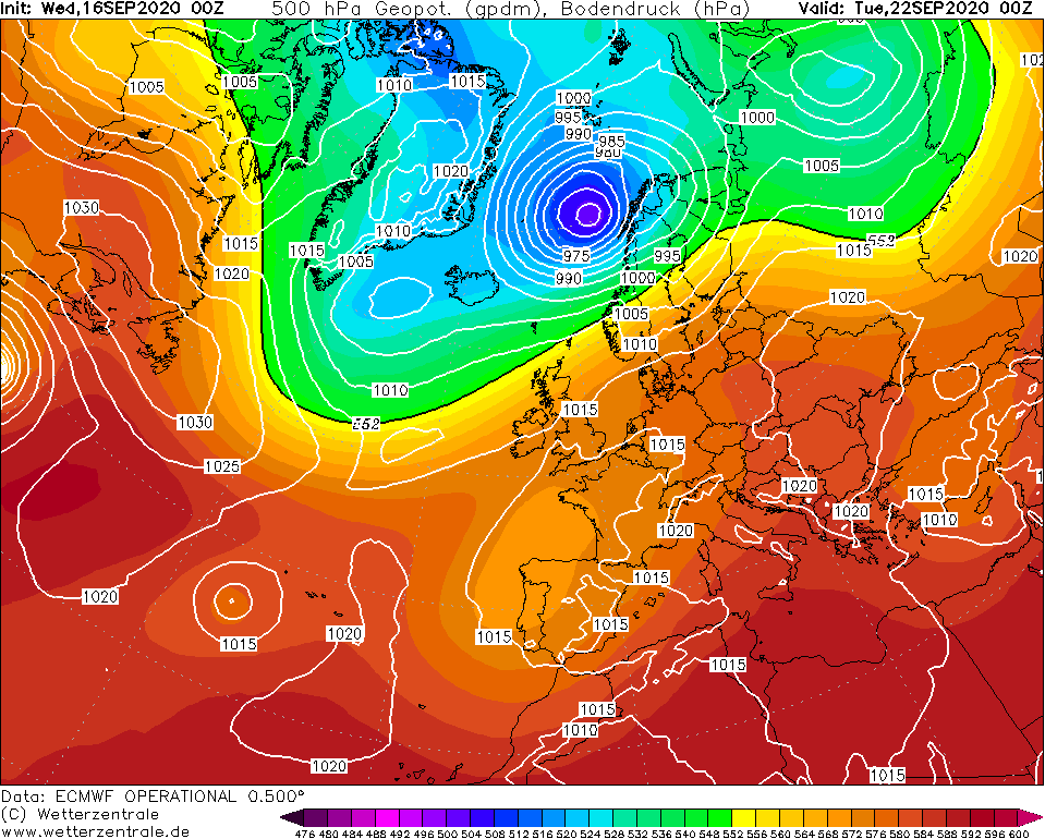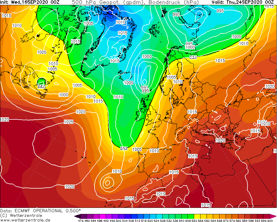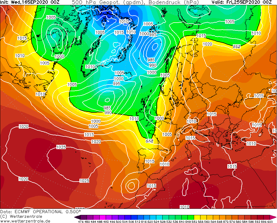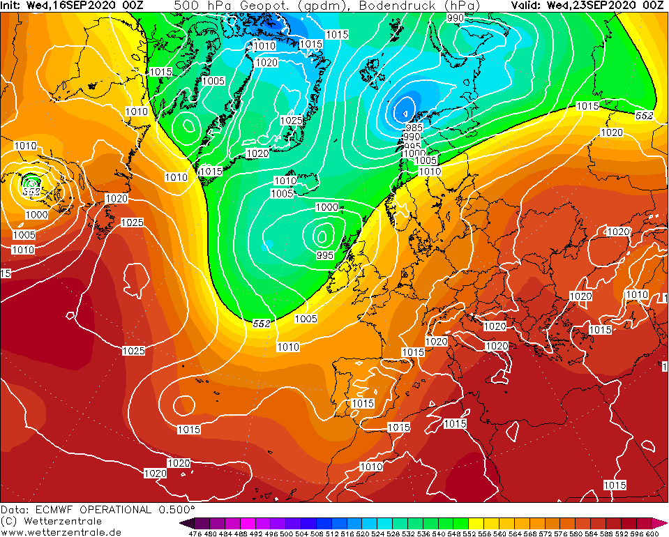 Bij GFS zien we ook al signalen dat ofwel de wisselvalligheid wordt uitgesteld, of dat het een tussenfase is en het stabiele en warme weer snel weer terugkeert. De EC Oper van heden morgen laat het volgende week ook tot vrijdag warm tot zeer warm blijven. De stroming wordt namelijk meer zuidelijk en depressies blijven op veilige afstand. Op vrijdag helpt een depressie juist mee om het nog warmer op hoogte te krijgen. Het zou me niet verbazen als het ook in de nieuwe werkweek weer een graad of 27 á 28 op een aantal dagen wordt in grote delen van de Benelux. Hiermee wordt echt wisselvalliger en koeler weer voorlopig weer op de lange baan geschoven.