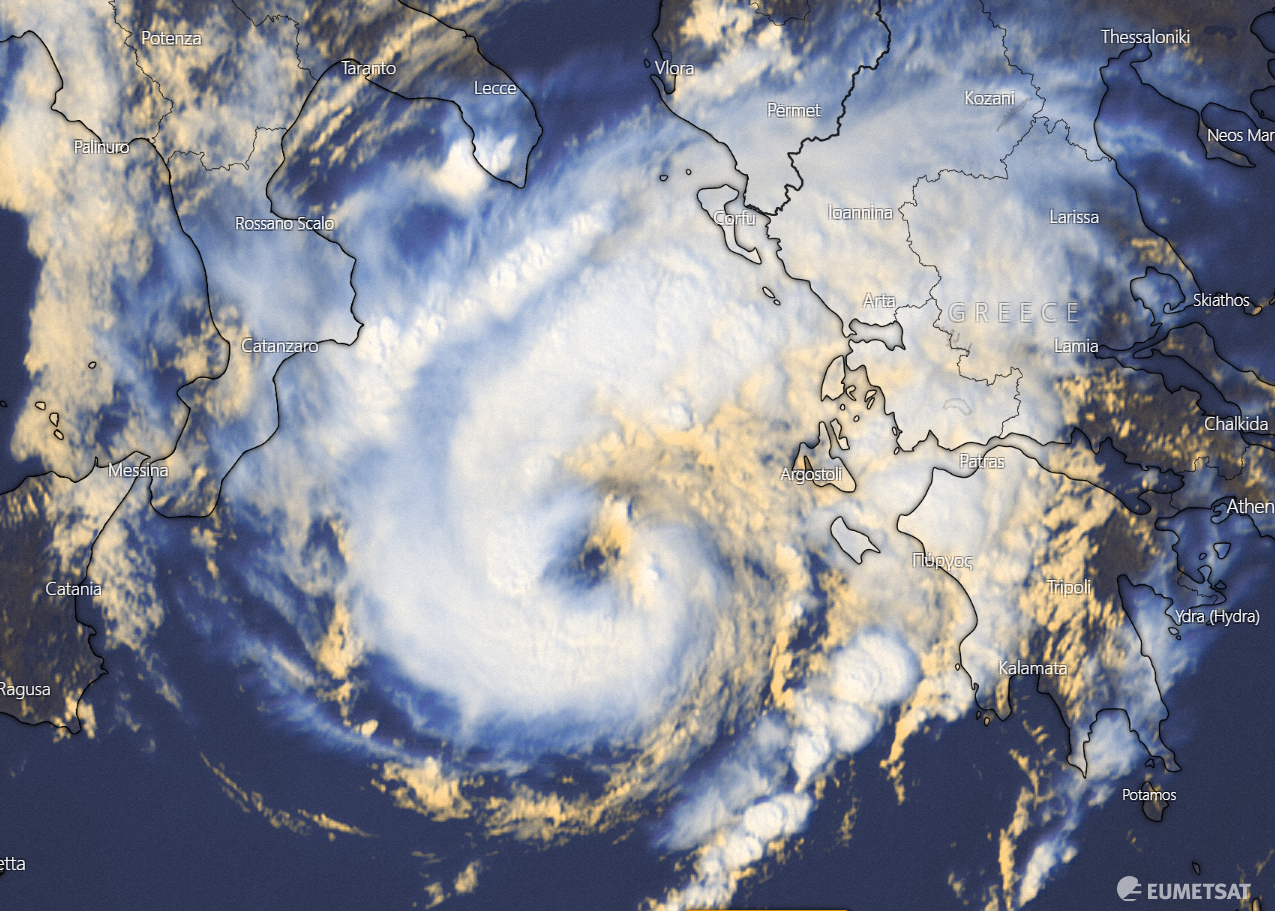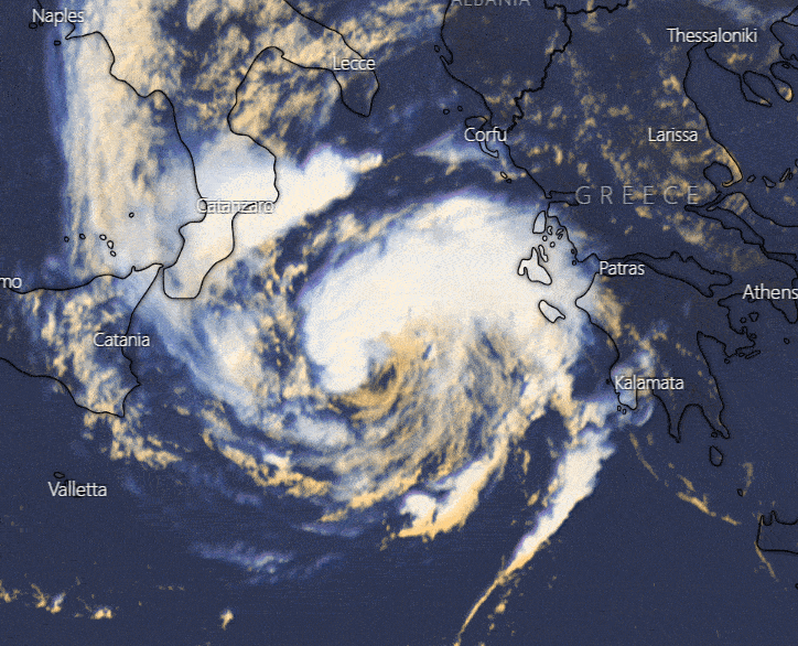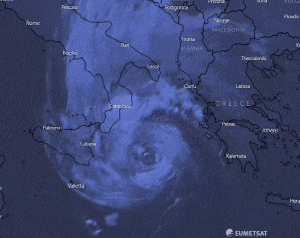 De medicane komt waarschijnlijk morgenochtend lokale tijd aan land met veel regen (lokaal 200+ mm) en verwachte windsnelheden boven de 120 km/h. ECMWF komt naast de windsnelheden ook met windstoten tot zo'n 200 km/h, ICON zit nog hoger met 250+ km/h en GFS juist lager met 140 km/h (waarschijnlijk deels door de lagere resolutie). Ik denk dat de middelste waarde van EC het dichtst bij de werkelijkheid zal zitten, maar hoe dan ook is dit echt een vrij unieke situatie.