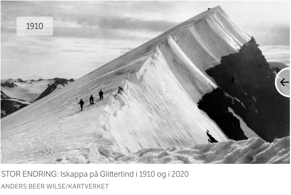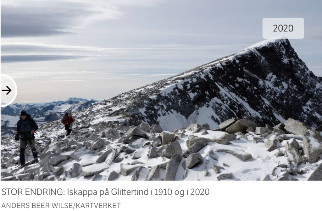 Van 1931 tot 2017 verdween er 25 meter sneeuw van de top van Glittertinden (ik was er zelf in 2017), maar in de afgelopen drie jaar is nog eens 5 meter verdwenen. Het gevolg is dat de boringen dit jaar snel klaar waren, men stootte al heel snel op kale rots. De sneeuw is bijna verdwenen. En dan te bedenken dat deze winter (en zomer) veel sneeuw gevallen is.