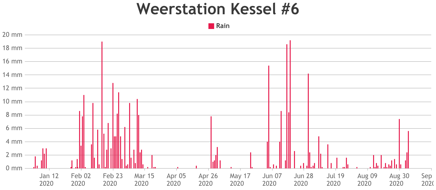 In de overige maanden weinig noemenswaardige neerslag. Veelal niet meer dan enkele mm per dag.