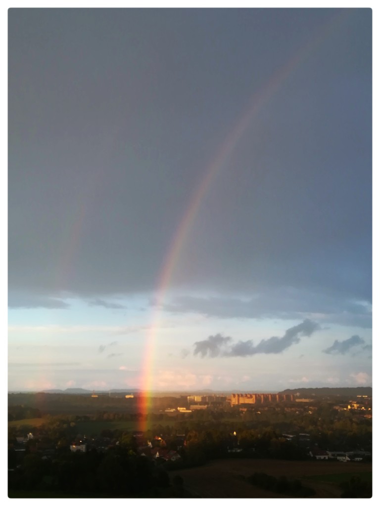 Hier ook, forse bui, gelige kleur in de lucht en een regenboog