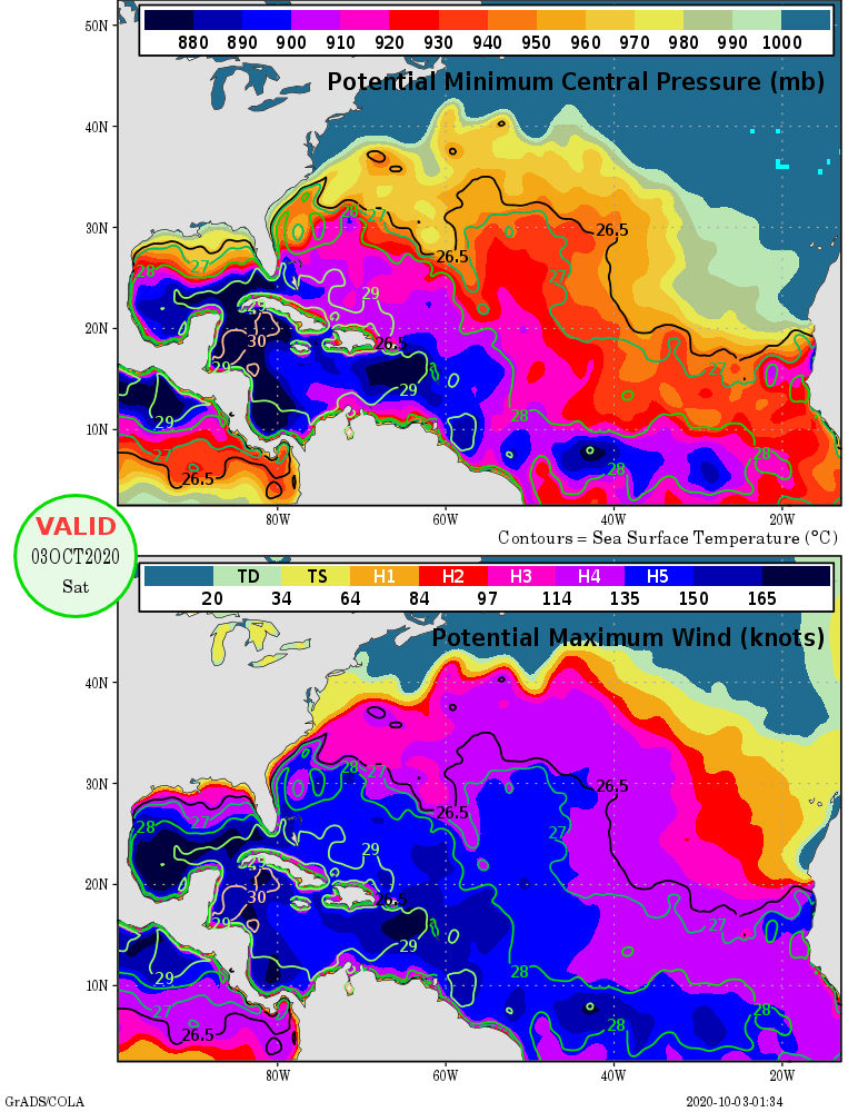 Daarnaast zijn er ook nog drie disturbances in de Atlantische Oceaan. De eerste disturbance bestaat uit een tropische golf die achter Gamma zit en zich nu ook in de warme Caribische Zee bevindt. De vormingskans is hoog met zo'n 80% de komende 5 dagen. Over het verwachte pad is het nog lastig om iets te zeggen, maar met een storm in de Caribische Zee moet je altijd oppassen, zeker in september en oktober. Invest 92L ligt eigenlijk in vrijwel de perfecte positie om een grote storm te worden. De zeetemperatuur is zeer hoog en zoals je hieronder kan zien is de oceaan op dit moment makkelijk in staat om eigenlijk overal in het verwachte pad van invest 92L alles tot aan en inclusief een cat 5 te ondersteunen. En ook de wind shear waar Gamma last van heeft zal waarschijnlijk minder zijn wanneer invest 92L in de Golf van Mexico komt. Dit is er dus eentje om in de gaten te houden.