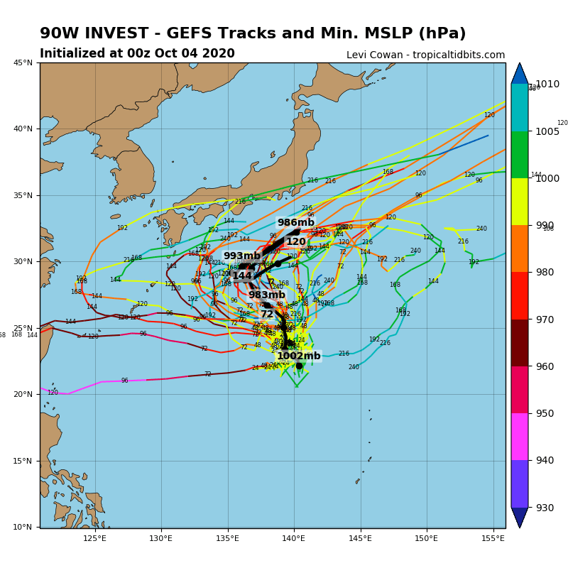 Op de West-Pacifische Oceaan is verder momenteel één disturbance, die zich ten Zuiden van Japan bevindt. Op basis van de GFS ensembles heeft de disturbance een hoge vormingskans met 17 van de 21 leden die de storm laten vormen. Waar de storm vervolgens naartoe gaan is nog onduidelijk. Eerst zal de disturbance verder naar het Noorden bewegen, maar daarna splits het ensemble zich op in leden die helemaal naar China gaan of juist ten Oosten van Japan trekken. De afgelopen 24 uur lijken wel steeds meer leden voor die Oostelijke oplossing te kiezen. Sommige van de leden laten de disturbance ook uitgroeien tot een flinke typhoon dus dit is iets om de komende dagen in de gaten te houden.